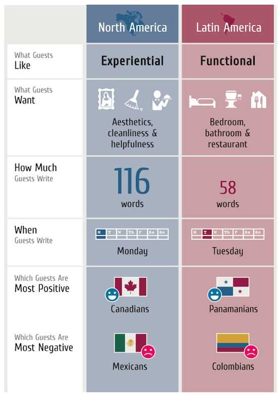 北美客户更啰嗦一些——他们的酒店点评长度几乎是拉美客人的两倍。