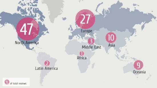 下面这幅地图展示了为豪华酒店撰写评论的用户地区分布比例。北美用户和欧洲用户以47%和27%占据前两名,而27%的欧洲用户中,有20%是英国人。
