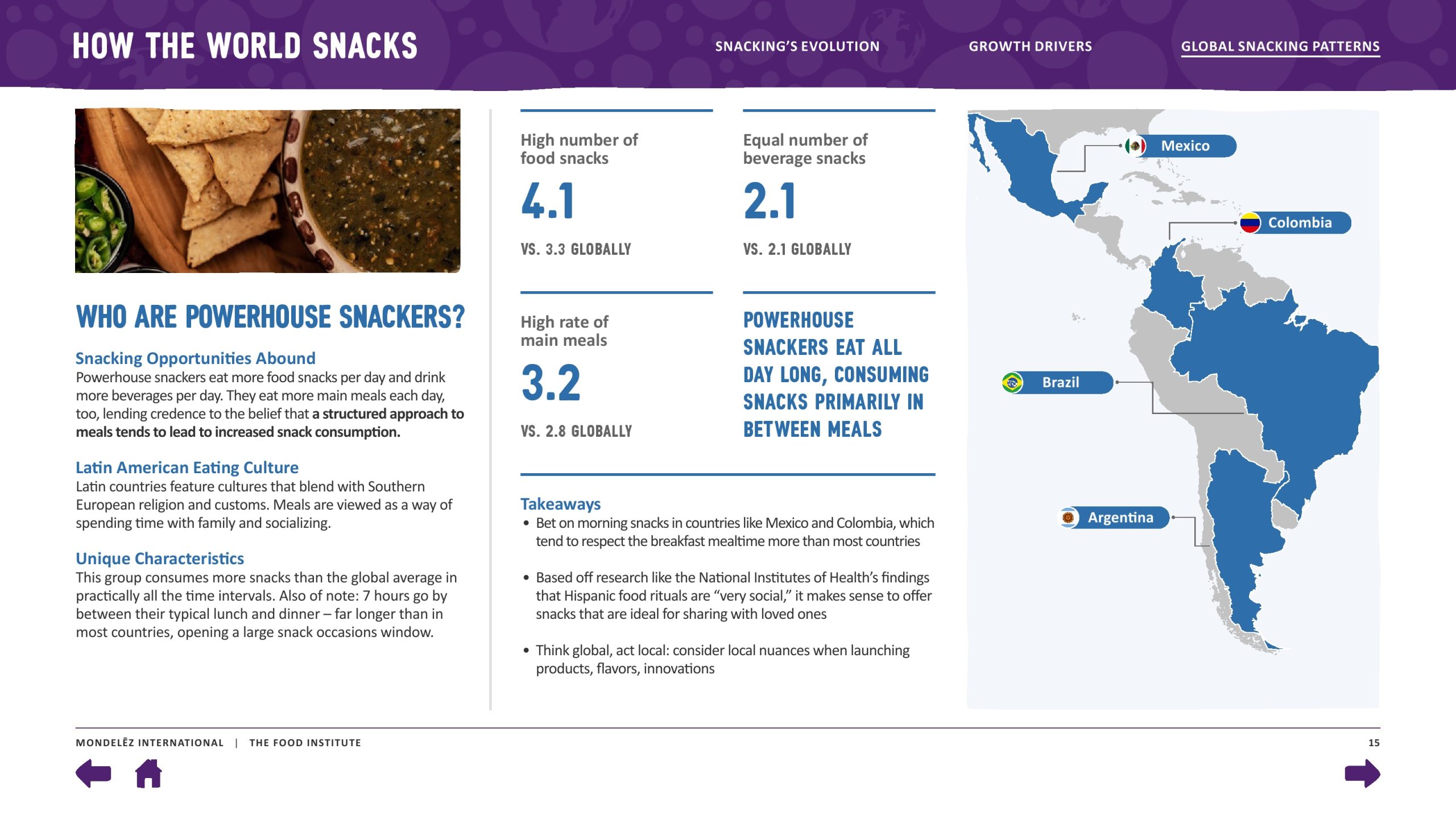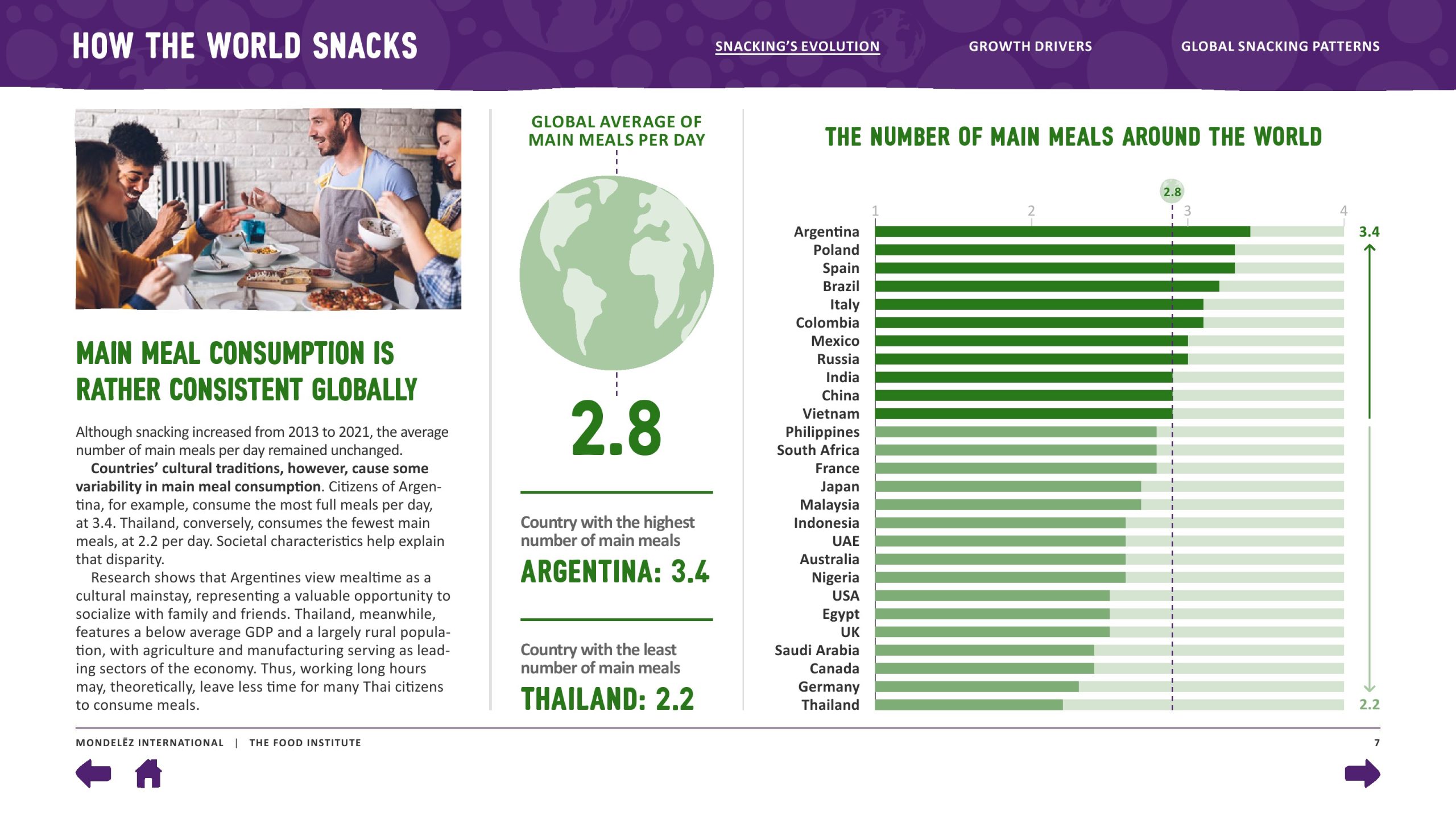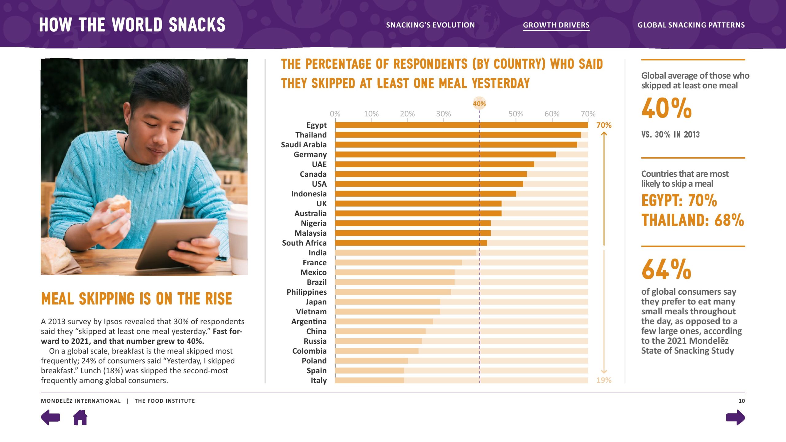 与此同时,许多全球消费者在午餐时间用小零食代替正餐;从2013年到2021年,在中午到下午3点之间吃零食的人数增长了22%。晚餐是全球消费者不吃零食的主要一餐,只有14%的受访者倾向于不吃晚餐。