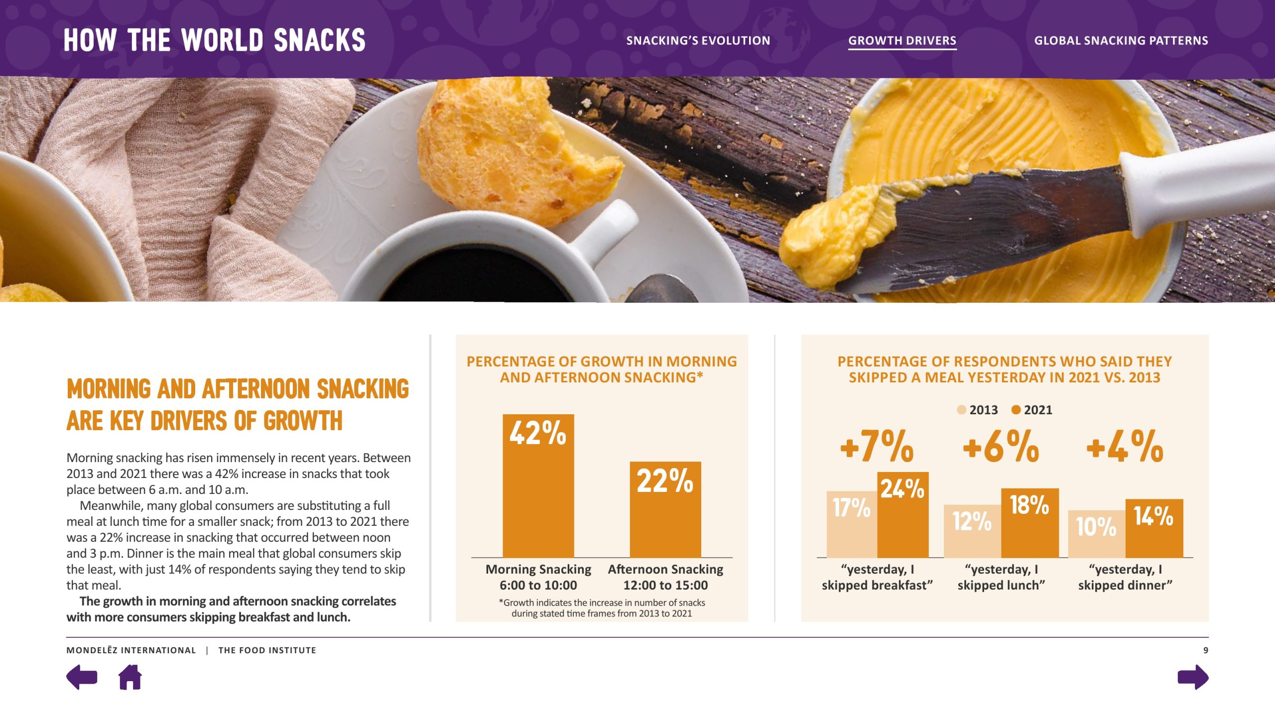 近年来,早餐零食的数量大幅增加。从2013年到2021年,在早上6点到10点之间吃零食的人数增长了42%。