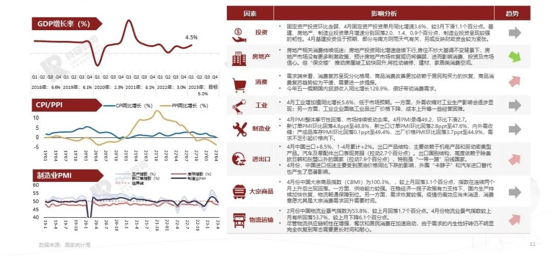 - 4月在去年低基数下消费增速反弹,但经济增长势头较3月有所放缓。经济复苏的力度在3月份复苏提前发力后稳中略降。居民消费需求有待进一步提振,楼市低迷也继续在消费、投资及市场信心等方面对宏观经济形成拖累。