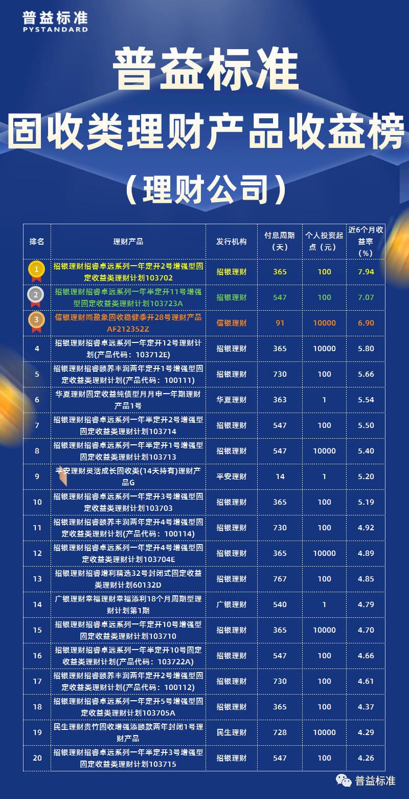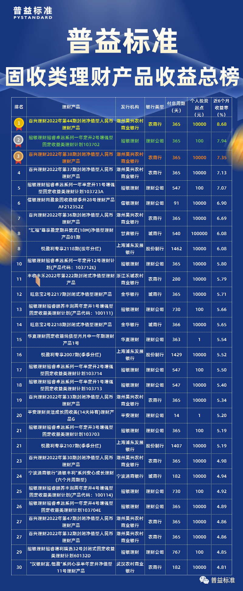 详细榜单情况如下:5月固收类理财产品收益率总榜