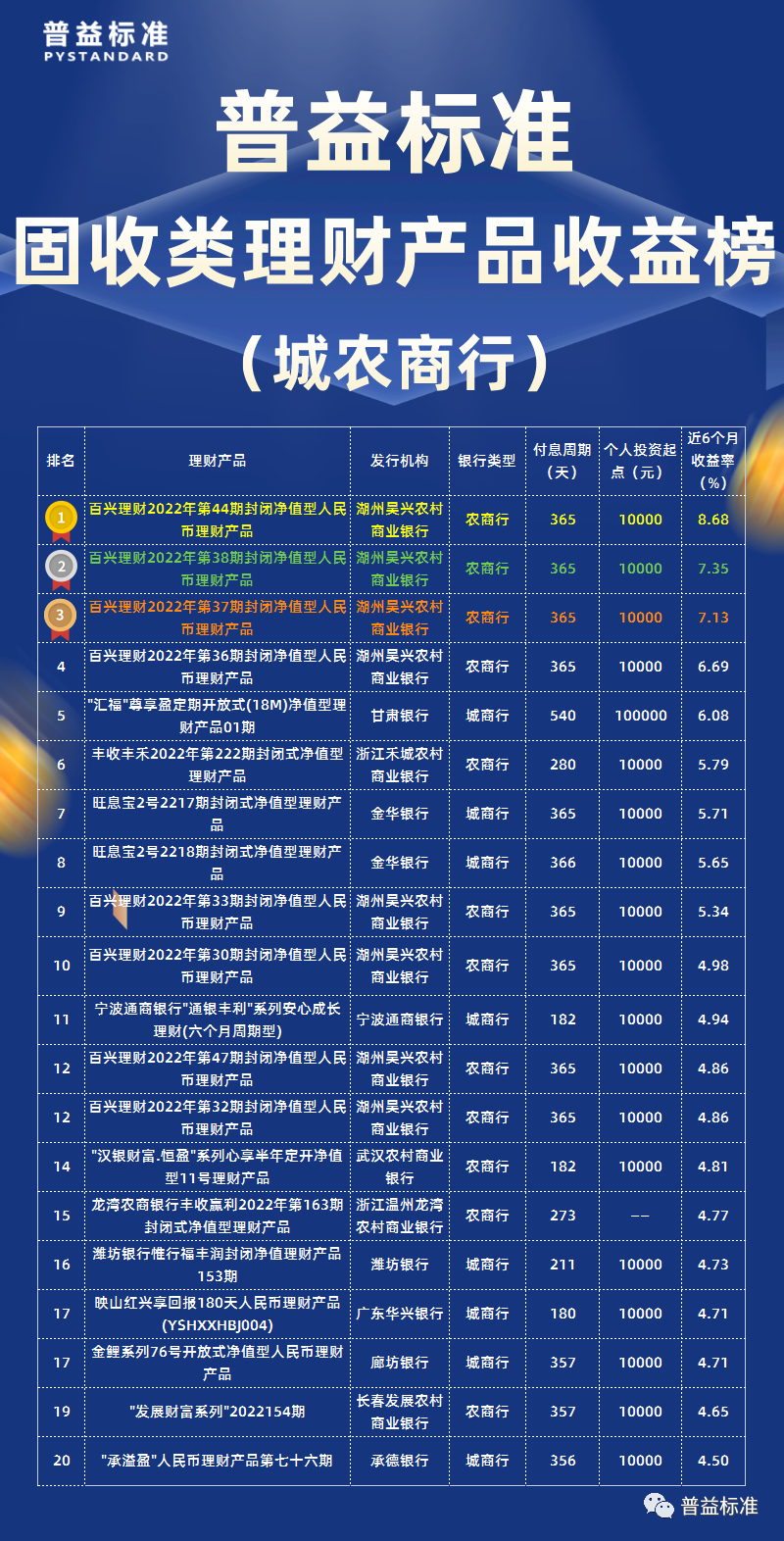 5月城农商行固收类产品收益率排行榜中,湖州吴兴农村商业银行的“百兴理财2022年第44期封闭净值型人民币理财产品”排名第一,其近六个月收益率约为8.68%;湖州吴兴农村商业银行的“百兴理财2022年第38期封闭净值型人民币理财产品”和“百兴理财2022年第37期封闭净值型人民币理财产品” 分别位居第二、第三位。本期榜单中,农商行有12款产品上榜,表现亮眼。