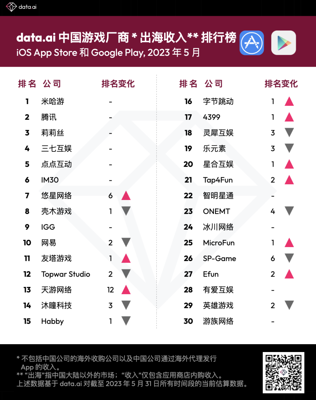 5月份中国游戏厂商及应用出海收入排行榜出炉,厂商收入榜单【前六名毫无变化】—— 按排名先后顺序分别是:第一米哈游、第二腾讯、第三莉莉丝、第四三七互娱、第五点点互动和第六名IM30。