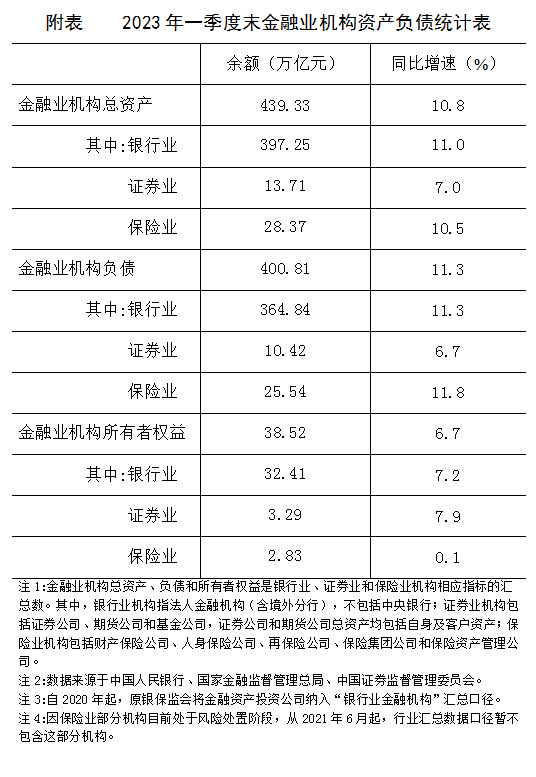 中国人民银行:2023年一季度末金融业机构总资产439.33万亿元 初步统计,2023年一季度末,我国金融业机构总资产为439.33万亿元,同比增长10.8%,其中,银行业机构总资产为397.25万亿元,同比增长11%;证券业机构总资产为13.71万亿元,同比增长7%;保险业机构总资产为28.37万亿元,同比增长10.5%。 金融业机构负债为400.81万亿元,同比增长11.3%,其中,银行业机构负债为364.84万亿元,同比增长11.3%;证券业机构负债为10.42万亿元,同比增长6.7%;保险业机构负债为25.54万亿元,同比增长11.8%。 更多阅读:中国人民银行:2019年第一季度城镇储户问卷调查报告中国人民银行:2022年二季度末我国金融业机构总资产407.42万亿元中国人民银行:2021年三季度末金融业机构总资产375.68万亿元中国人民银行:2023年3月份金融市场运行情况中国人民银行:2023年第一季度中国货币政策执行报告中国人民银行:2020年一季度末金融业机构总资产332.94万亿元中国人民银行:2022年三季度小额贷款公司统计数据报告中国人民银行:2019年11月社会融资规模存量统计数据报告中国人民银行:2022年二季度小额贷款公司统计数据报告中国人民银行:2023年第一季度企业家问卷调查中国人民银行:2023年上半年地区社会融资规模增量统计表中国人民银行:2021年一季度地区社会融资规模增量统计表中国人民银行:2023年4月份金融市场运行情况中国人民银行:2020年第四季度中国货币政策执行报告中国人民银行:2020年第三季度中国货币政策执行报告
