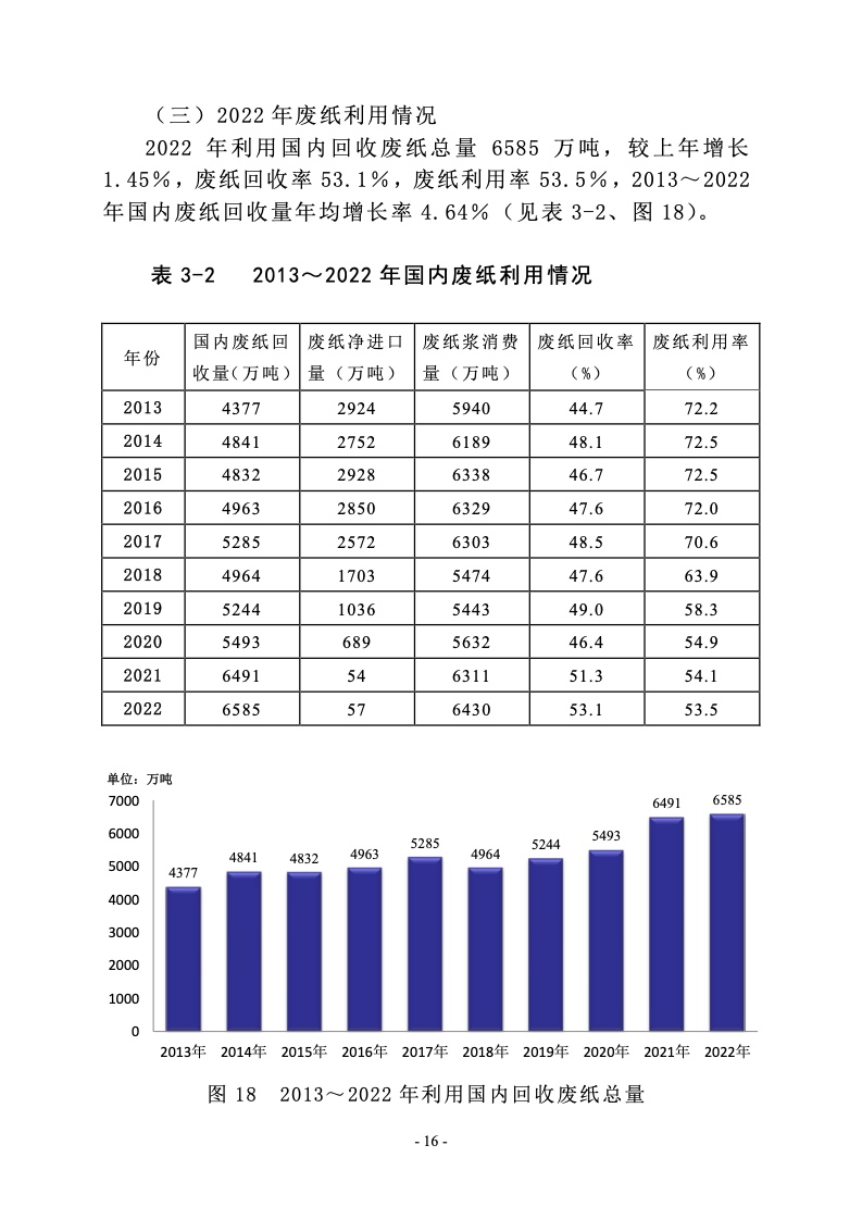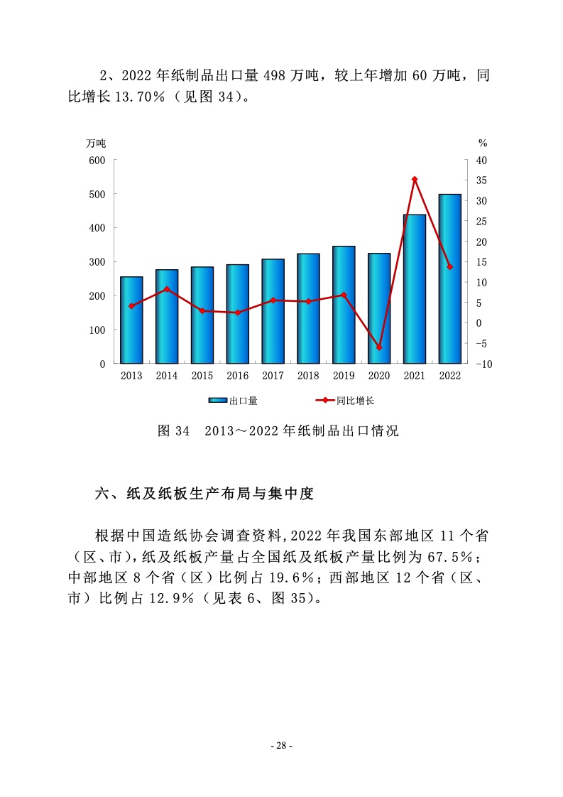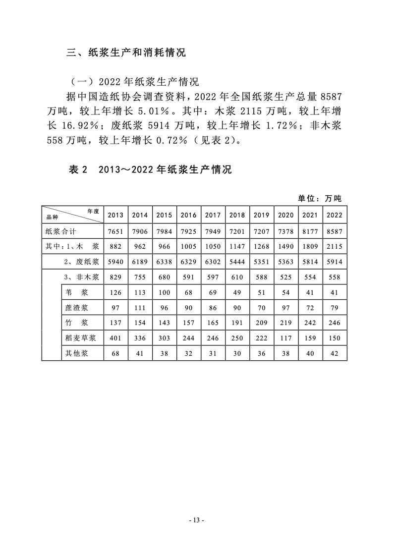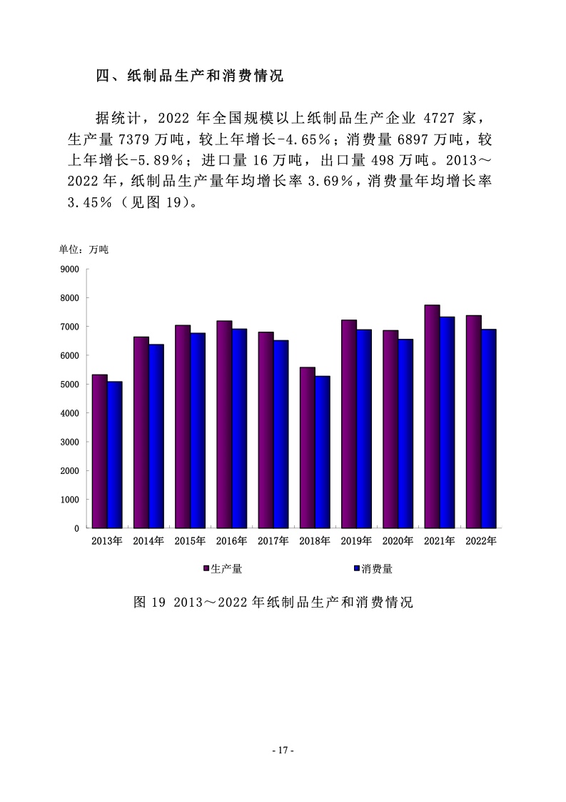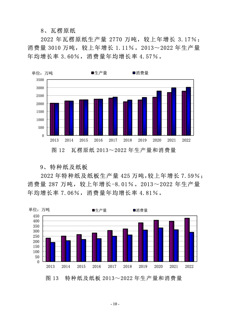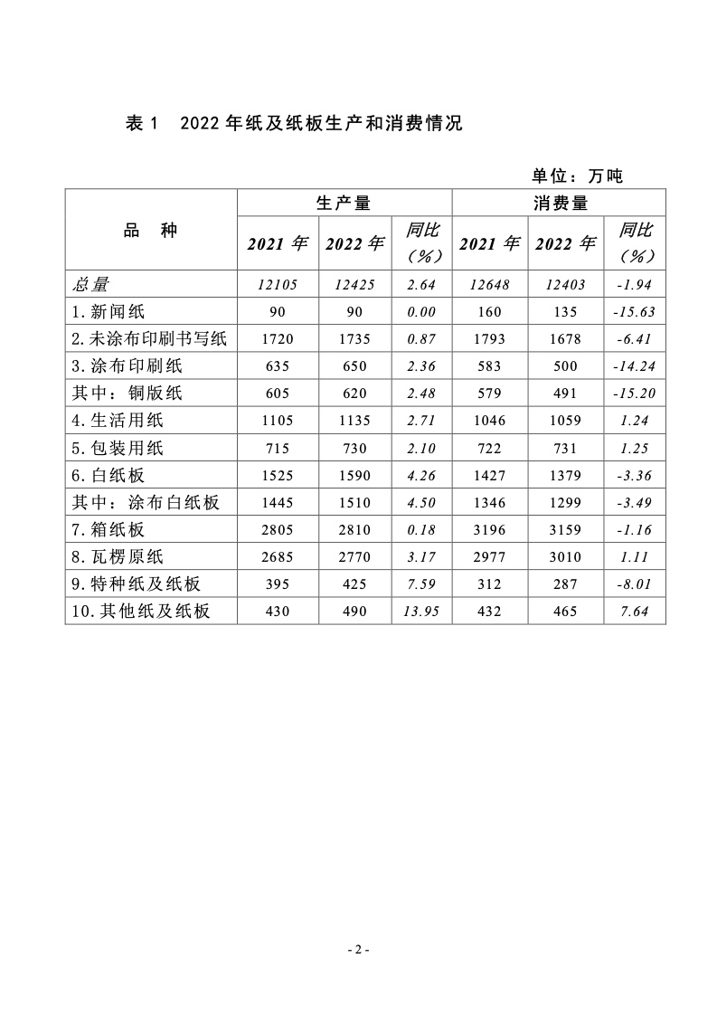 据中国造纸协会调查资料,2022 年全国纸及纸板生产企业约 2500 家,全国纸及纸板生产量 12425 万吨,较上年增长 2.64%。 消费量 12403 万吨,较上年增长-1.94%,人均年消费量为 87.84 千克(14.12 亿人)。2013~2022 年,纸及纸板生产量年均增长 率 2.32%,消费量年均增长率 2.67%。