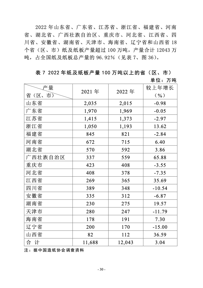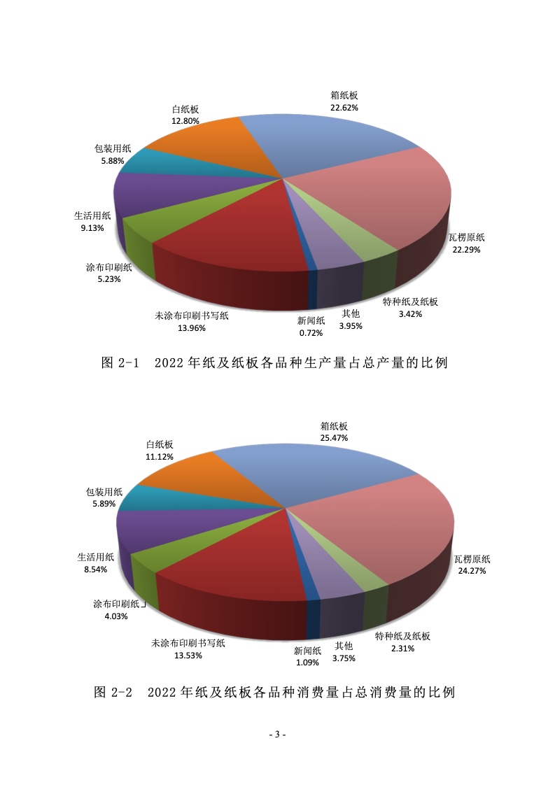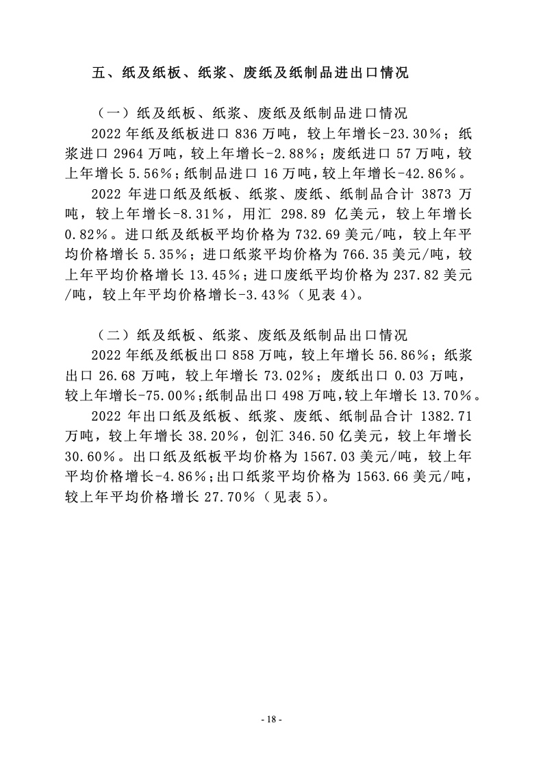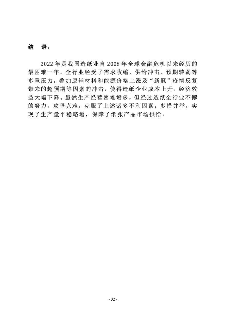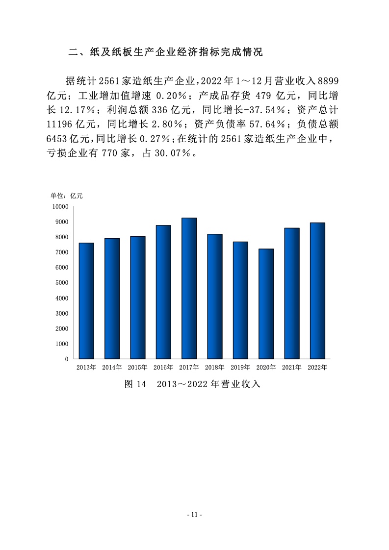 据统计,制浆造纸及纸制品全行业 2022 年完成纸浆、纸及 纸板和纸制品产量合计 28391 万吨,同比增长 1.32%;其中: 纸及纸板产量12425万吨,较上年增长2.64%;纸浆产量8587 万吨,较上年增长 5.01%;纸制品产量 7379 万吨,较上年增 长-4.65%;全行业营业收入完成 1.52 万亿元,同比增长 0.44%; 实现利润总额 621 亿元,同比增长-29.79%。