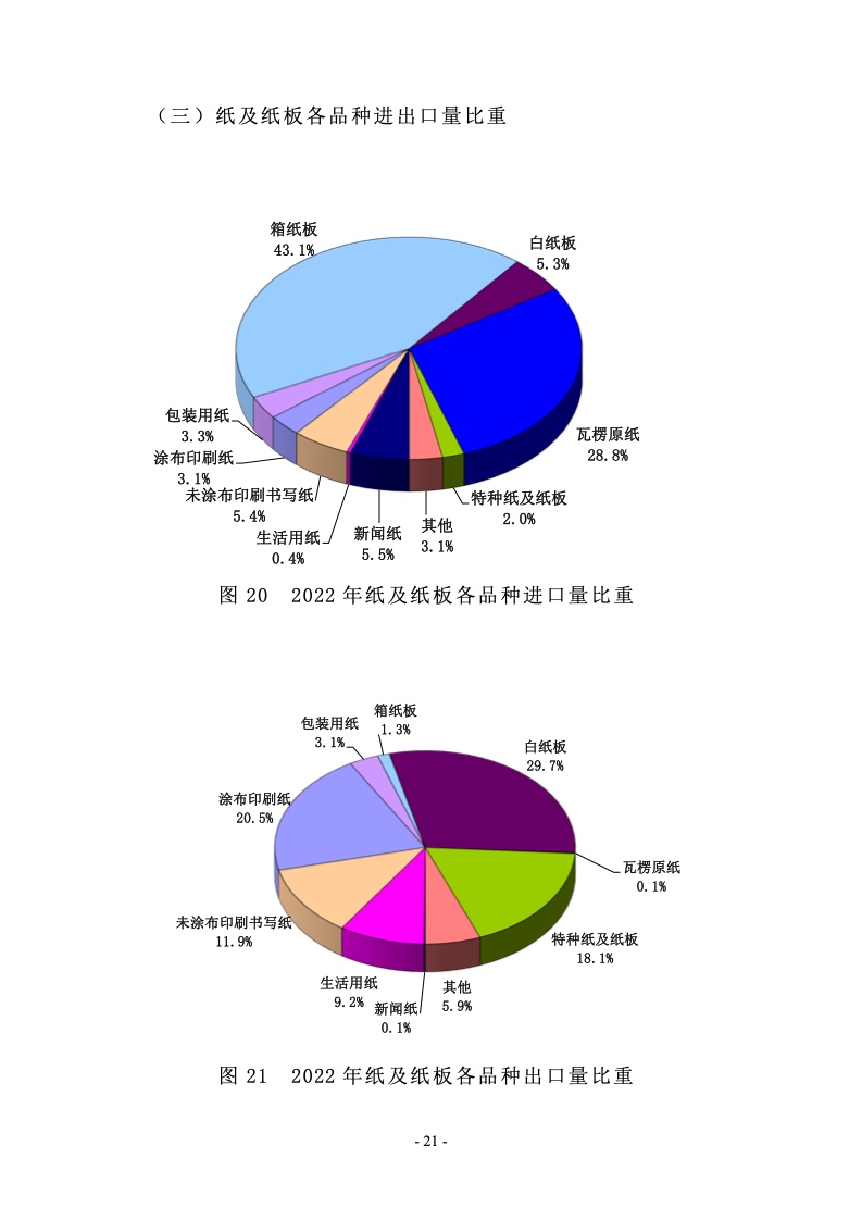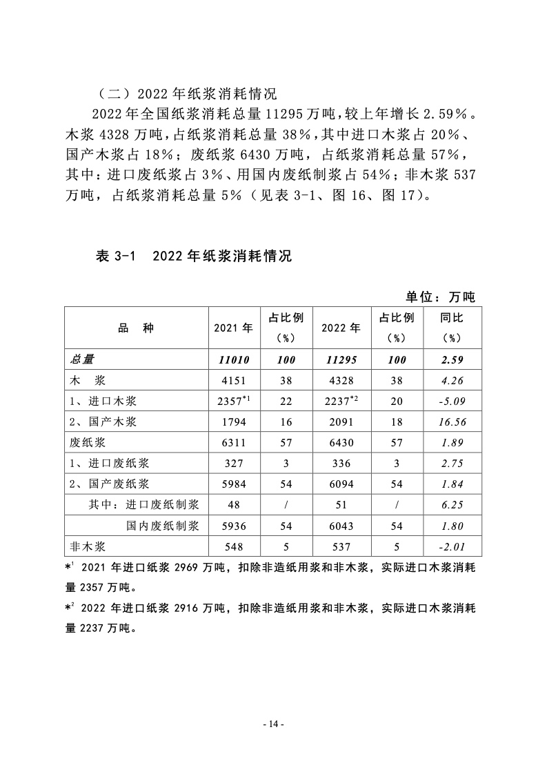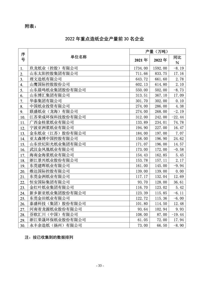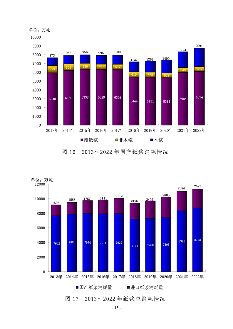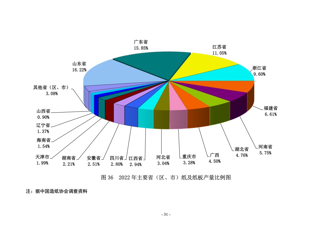 据统计,制浆造纸及纸制品全行业 2022 年完成纸浆、纸及 纸板和纸制品产量合计 28391 万吨,同比增长 1.32%;其中: 纸及纸板产量12425万吨,较上年增长2.64%;纸浆产量8587 万吨,较上年增长 5.01%;纸制品产量 7379 万吨,较上年增 长-4.65%;全行业营业收入完成 1.52 万亿元,同比增长 0.44%; 实现利润总额 621 亿元,同比增长-29.79%。
