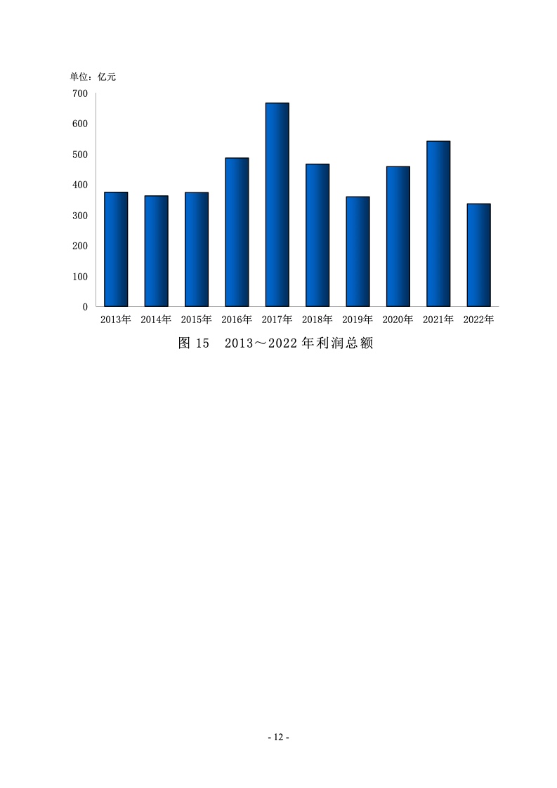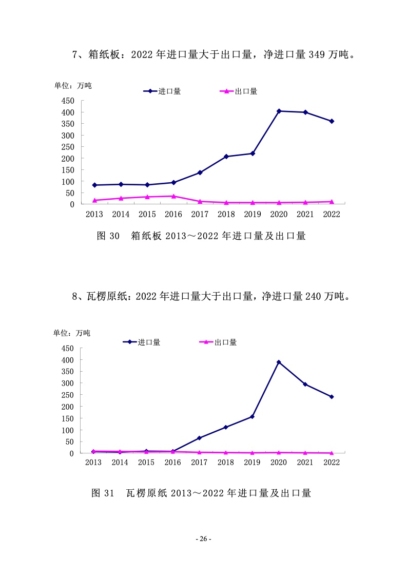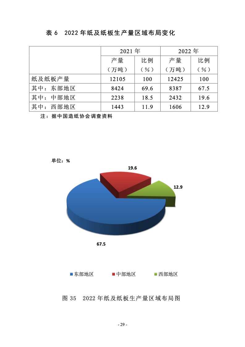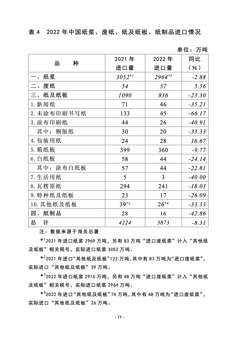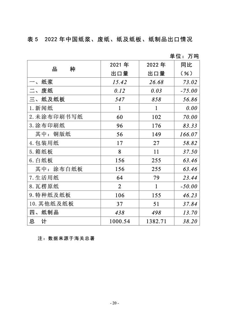 据统计,制浆造纸及纸制品全行业 2022 年完成纸浆、纸及 纸板和纸制品产量合计 28391 万吨,同比增长 1.32%;其中: 纸及纸板产量12425万吨,较上年增长2.64%;纸浆产量8587 万吨,较上年增长 5.01%;纸制品产量 7379 万吨,较上年增 长-4.65%;全行业营业收入完成 1.52 万亿元,同比增长 0.44%; 实现利润总额 621 亿元,同比增长-29.79%。
