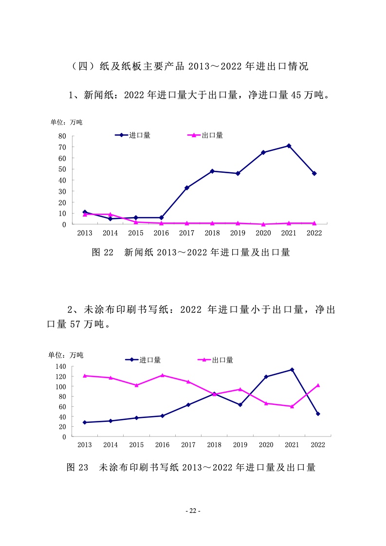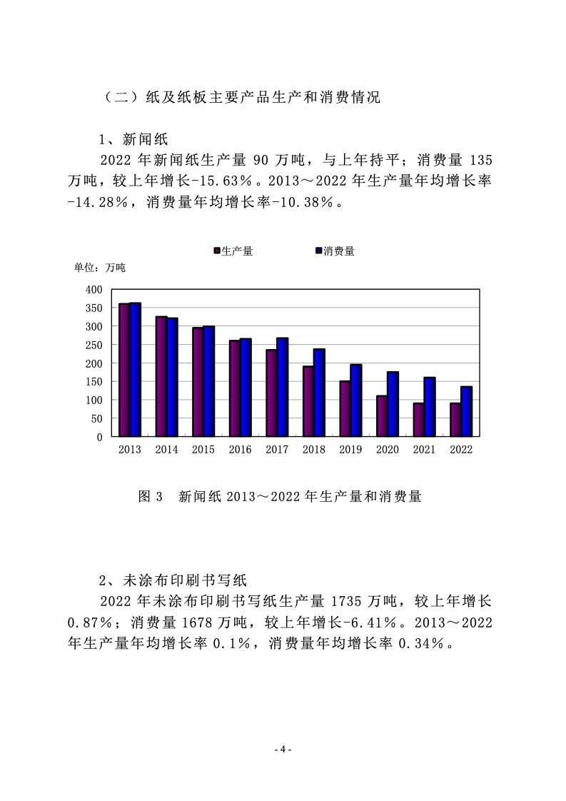2022 年新闻纸生产量 90 万吨,与上年持平;消费量 135万吨,较上年增长-15.63%。2013~2022 年生产量年均增长率 -14.28%,消费量年均增长率-10.38%。