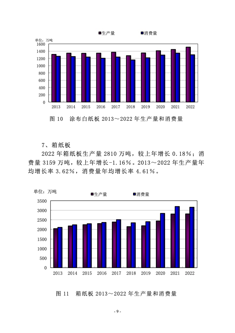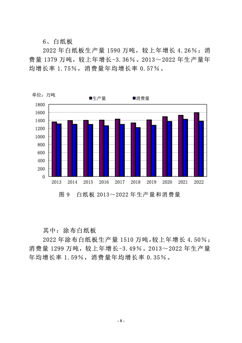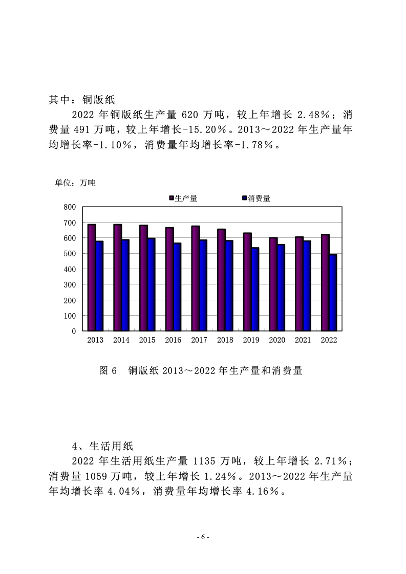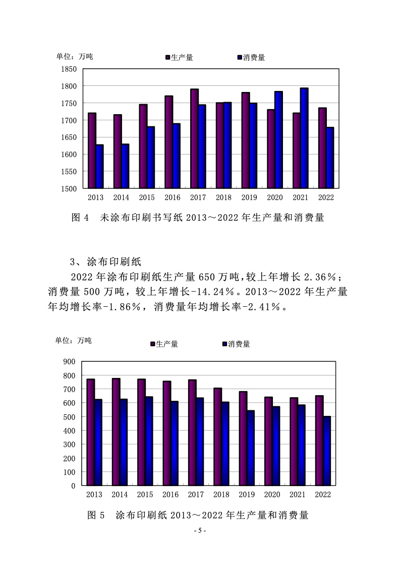 2022 年涂布印刷纸生产量 650 万吨,较上年增长 2.36%;消费量 500 万吨,较上年增长-14.24%。2013~2022 年生产量 年均增长率-1.86%,消费量年均增长率-2.41%。