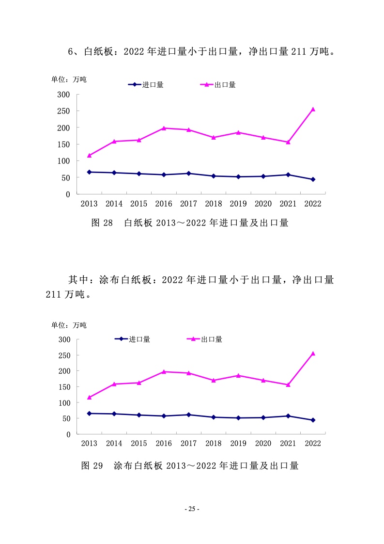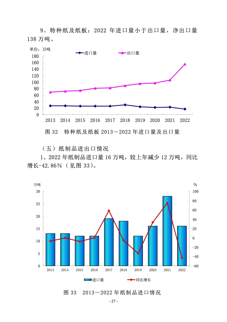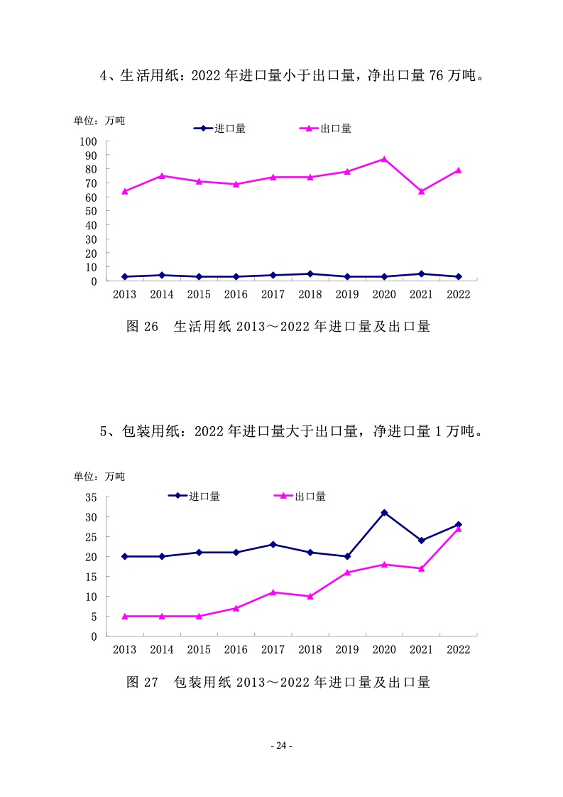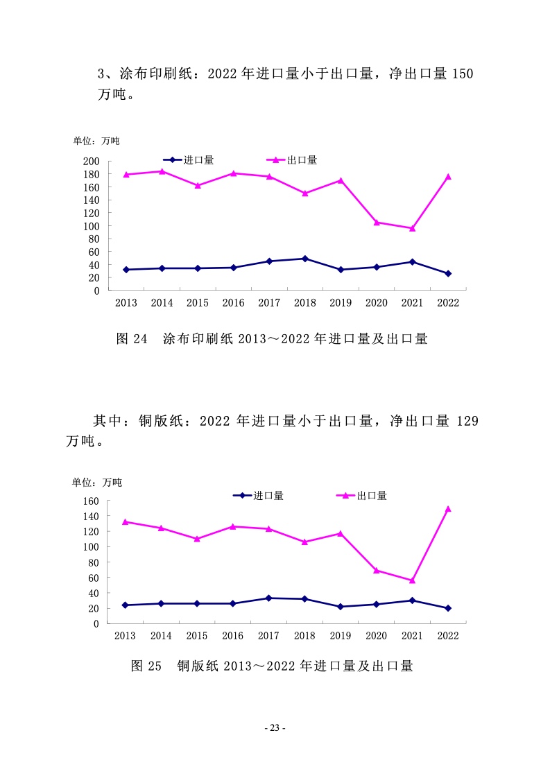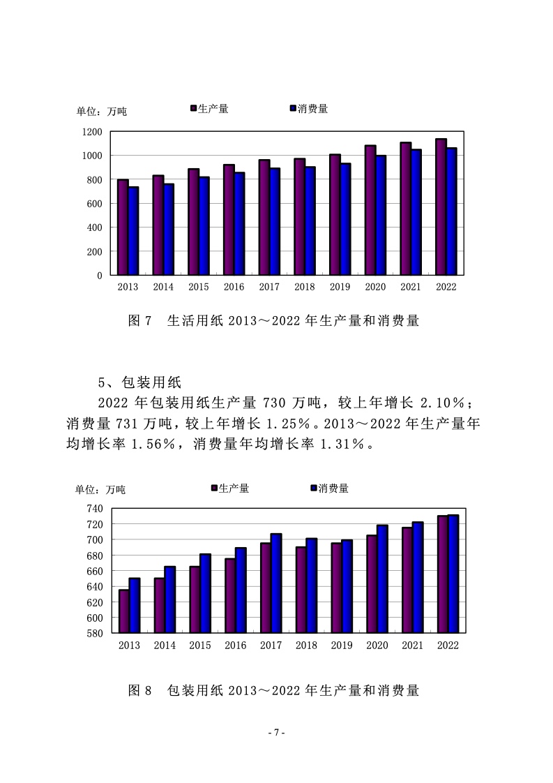 2022 年涂布印刷纸生产量 650 万吨,较上年增长 2.36%;消费量 500 万吨,较上年增长-14.24%。2013~2022 年生产量 年均增长率-1.86%,消费量年均增长率-2.41%。