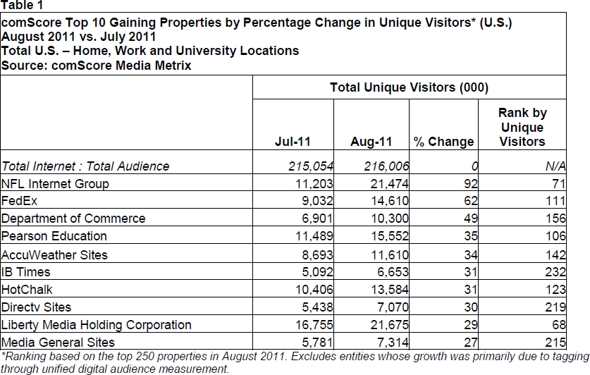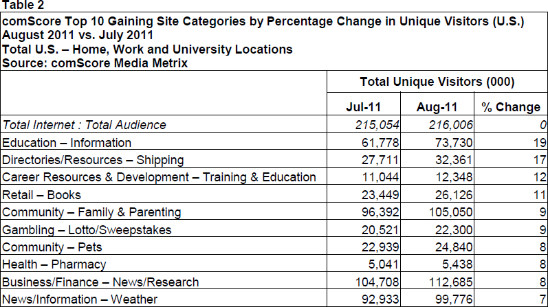 2011年8月,教育信息是增长最快的领域,7月用户数量增长19%到7370万人,培生教育是该领域访问量最大的网站,UV为1560万人,然后是Hotchalk、ClassesUSA等
