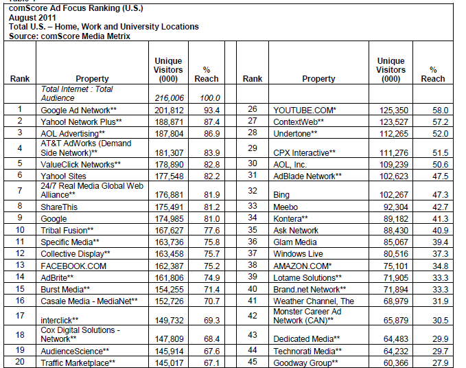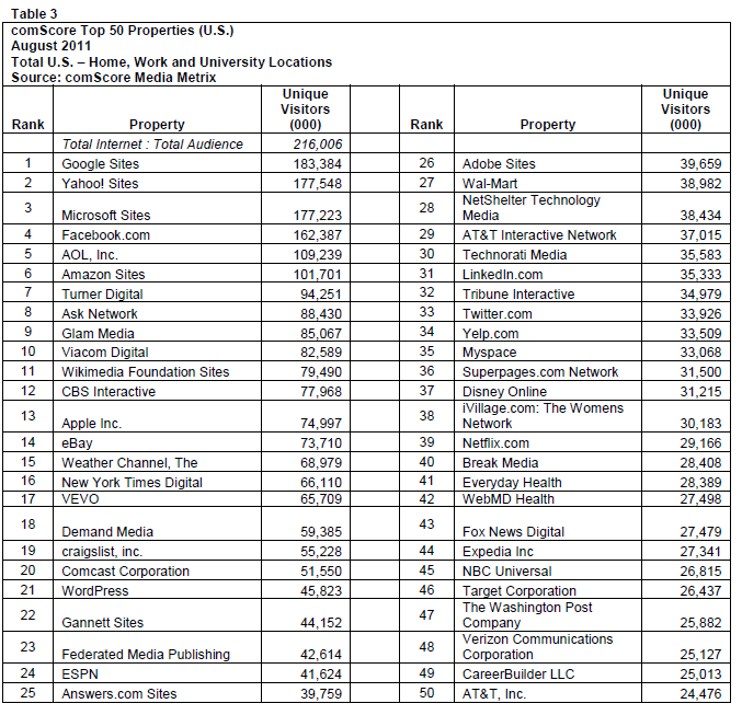 谷歌仍然是最大的网站,用户量为1.834亿人,然后是Yahoo的站点和微软的站点(具体见图)