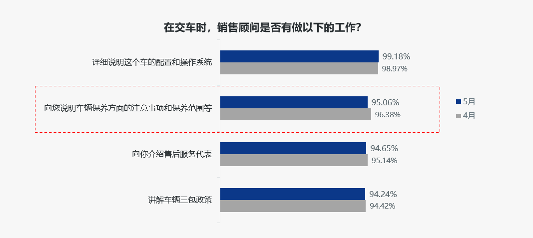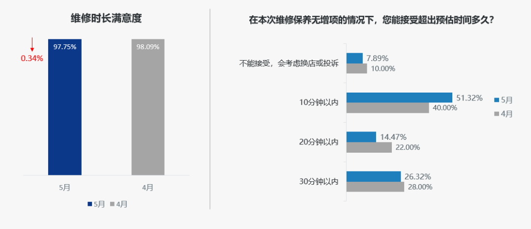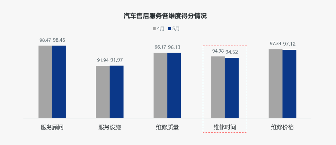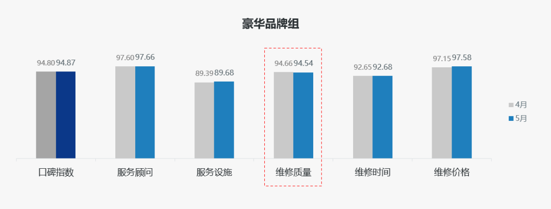 豪华品牌组:豪华品牌组售后服务口碑指数为94.87分,环比提升0.07分;在售后服务五维度中,维修质量维度微降0.12分外,其他维度均环比提升。