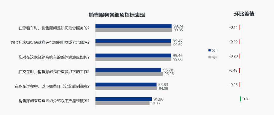《报告》显示,2023年5月,汽车销售服务口碑指数为96.52分,环比下降0.13分。本月数据覆盖了全国25个1~5线城市,55家经销商,21个品牌的1020个有效样本量。