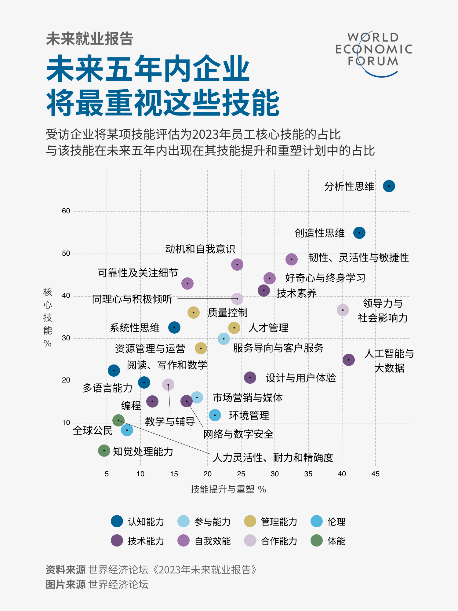 - 报告称,未来五年,企业最需要的技能包括分析性思维、同理心和积极倾听能力,以及领导力和社会影响力。