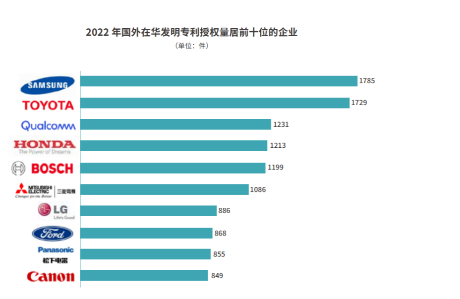 从2022年国外在华发明专利授权量居前十位的企业排名来看,三星以1785件排名第一,丰田以1729件排名第二,高通以1231件排名第三。