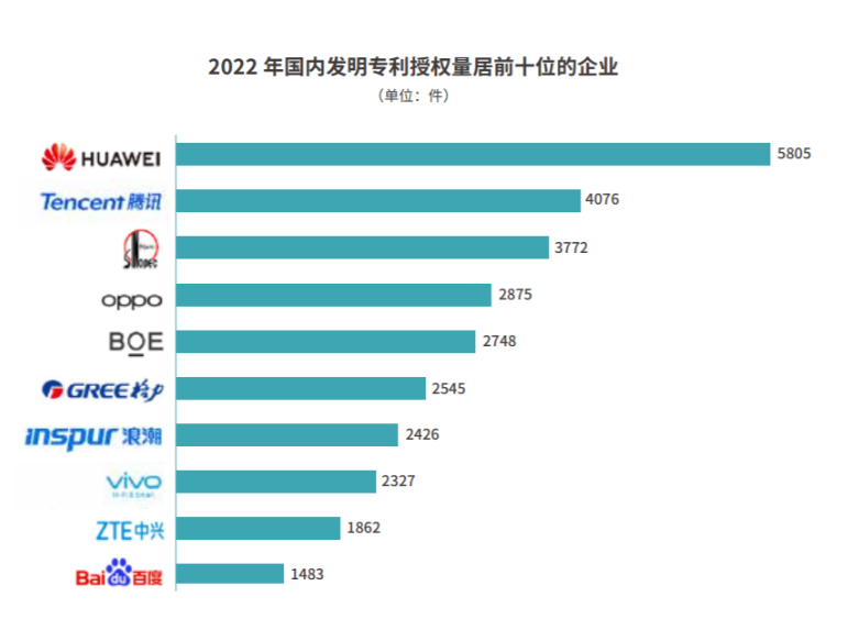 国家知识产权局发布了《2022年度报告》提到,2022年,授权发明专利79.8万件,同比增长14.7%。其中,国内发明专利授权69.6万件,占总量的87.1%。从2022年国内发明专利授权量居前十位的企业排名来看,华为以5805件排名第一;腾讯以4076件排名第二,OPPO、京东方、浪潮、vivo、中兴均上榜。