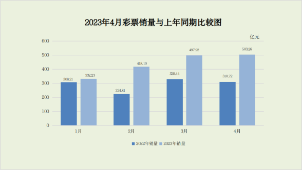 4月份,全国共销售彩票503.26亿元[1],同比增加192.54亿元,增长62.0%。其中,福利彩票机构销售155.97亿元,同比增加36.28亿元,增长30.3%;体育彩票机构销售347.29亿元,同比增加156.26亿元,增长81.8%。主要原因是受体育赛事带动效应和彩票游戏促销等因素影响,竞猜型彩票和即开彩票增长较快。