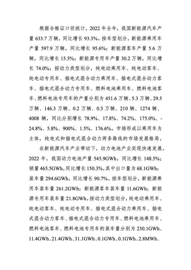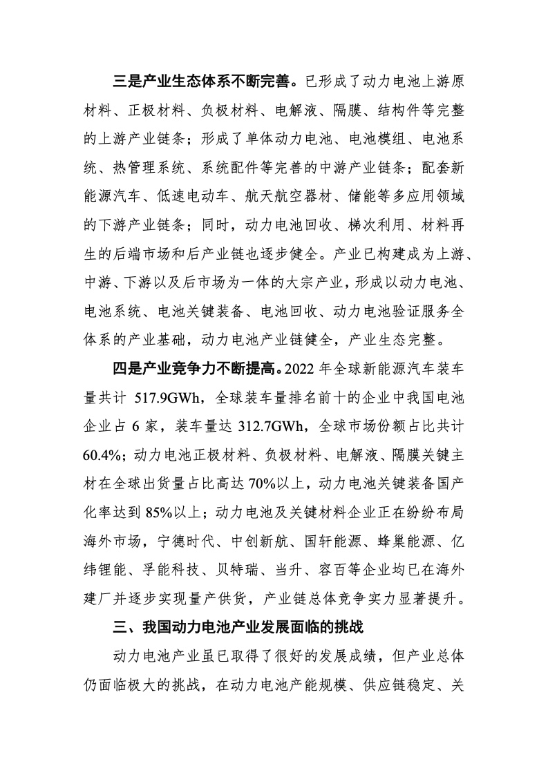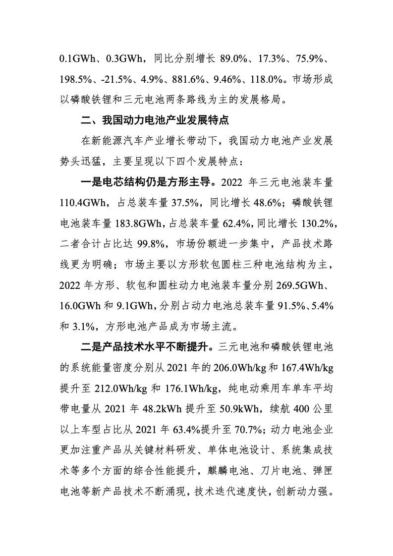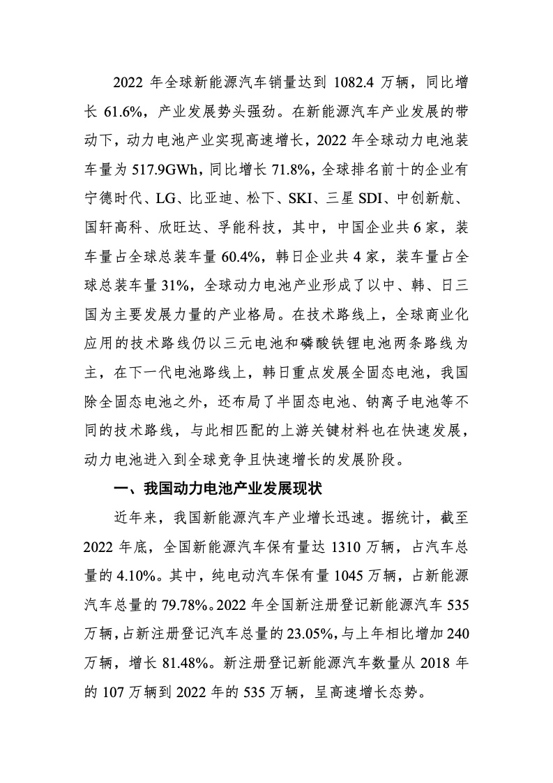 2022 年全球新能源汽车销量达到 1082.4 万辆,同比增 长 61.6%,产业发展势头强劲。在新能源汽车产业发展的带 动下,动力电池产业实现高速增长,2022 年全球动力电池装 车量为 517.9GWh,同比增长 71.8%,全球排名前十的企业有 宁德时代、LG、比亚迪、松下、SKI、三星 SDI、中创新航、 国轩高科、欣旺达、孚能科技,其中,中国企业共 6 家,装 车量占全球总装车量 60.4%,韩日企业共 4 家,装车量占全 球总装车量 31%,全球动力电池产业形成了以中、韩、日三 国为主要发展力量的产业格局。