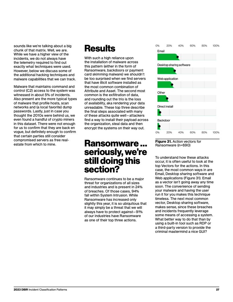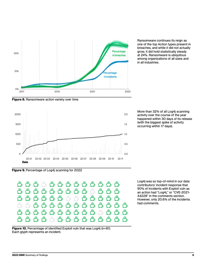 勒索软件持续成为数据泄露中出现最频繁的行动类型之一,尽管其实际增长并不明显,但其在统计上保持了24%的比例。勒索软件已经普遍存在于各种规模和各个行业的组织中。