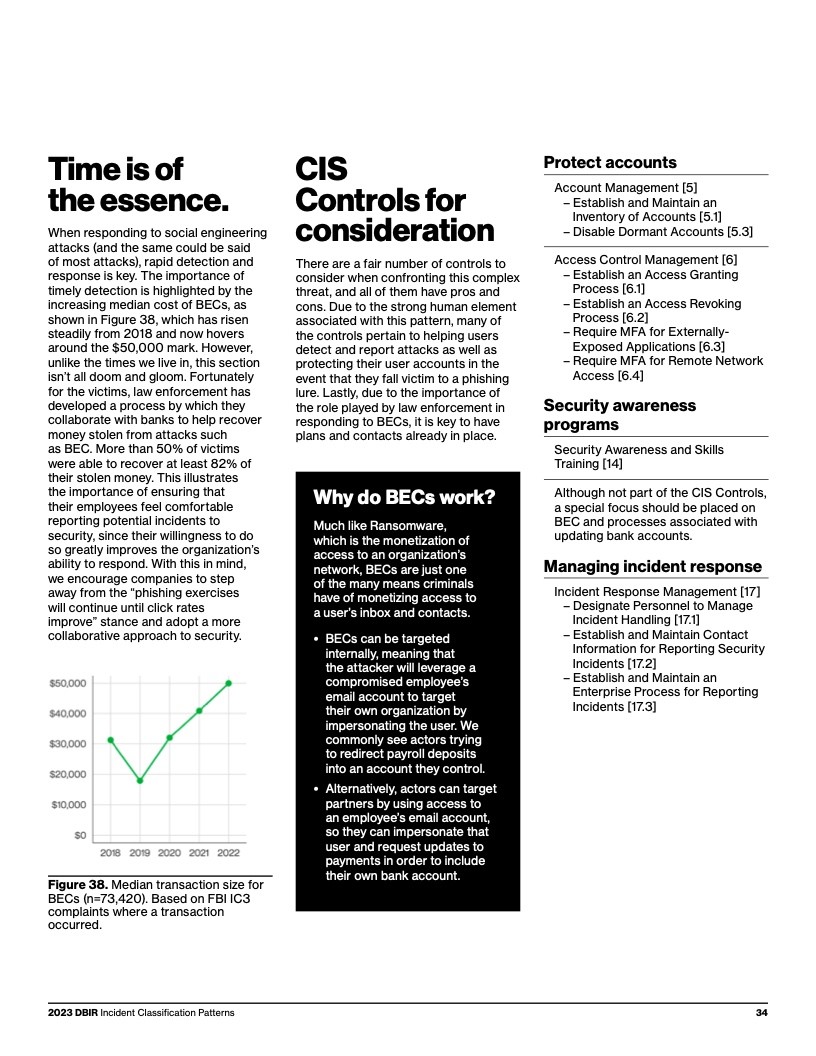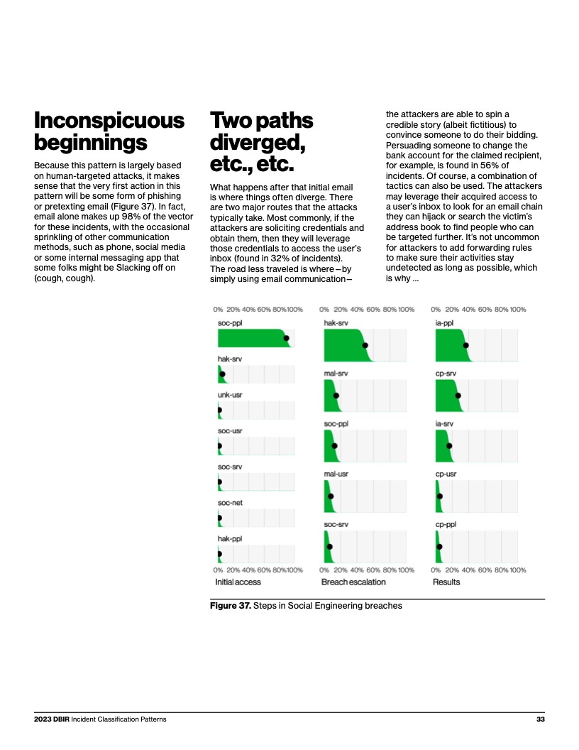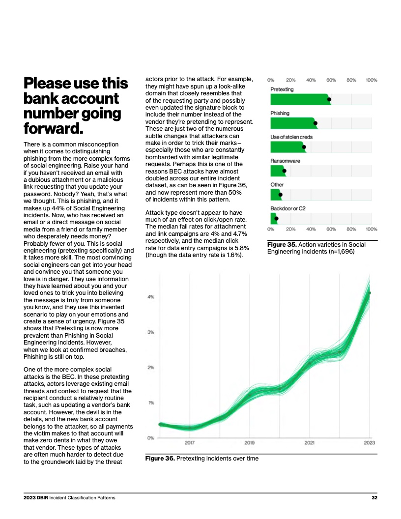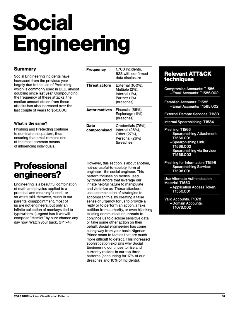 对于网络犯罪分子来说,社会工程攻击通常非常有效且利润丰厚。也许这就是为什么商业电子邮件泄露(BEC)攻击(本质上是假托攻击)在整个事件数据集中几乎翻了一番,并代表了社会工程模式中50%以上的事件。