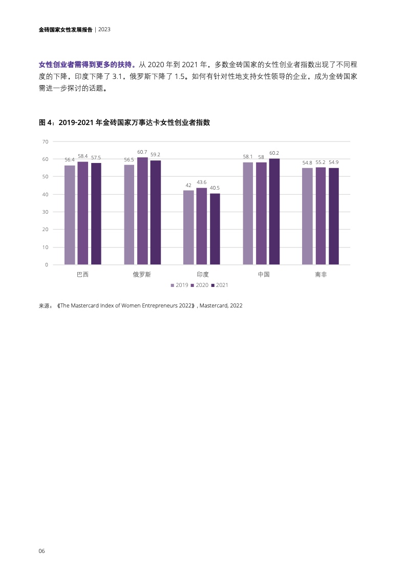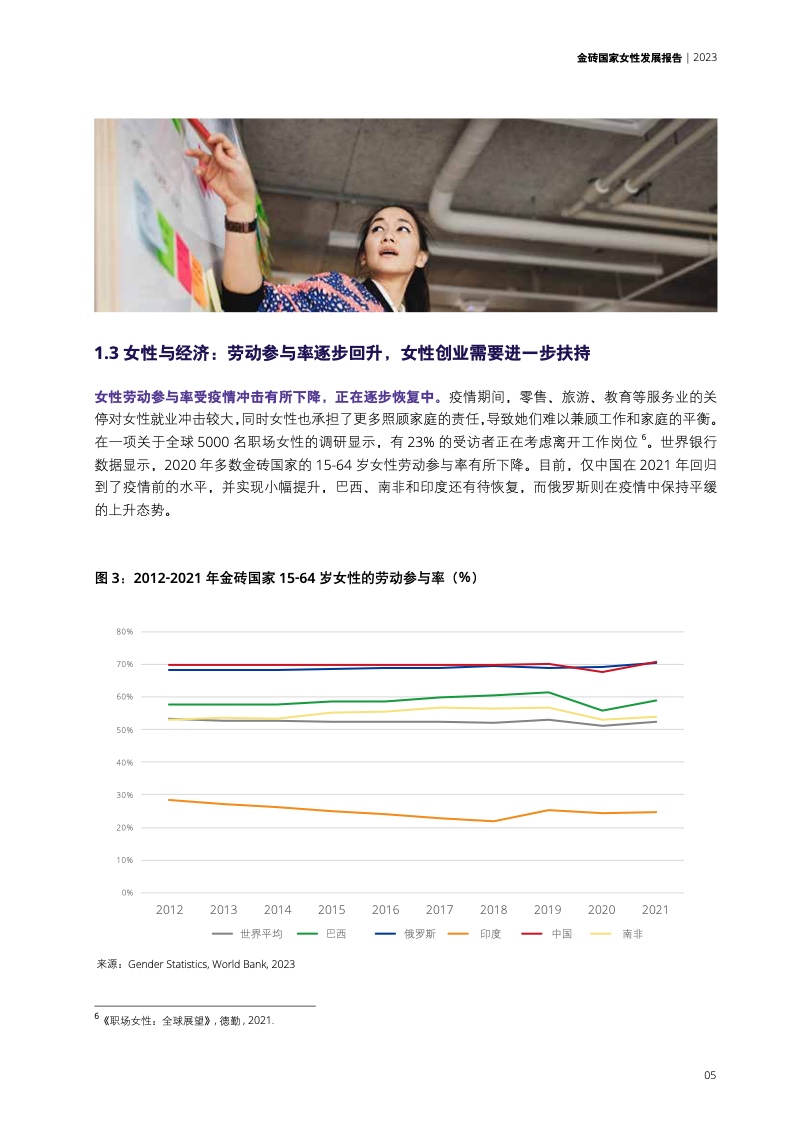 《报告》显示在经济方面,尽管受疫情影响女性劳动参与率有所下降,但目前,金砖国家各国正在逐步恢复中,中国女性的劳动参与率在2021年回归到了疫情前的水平,并实现小幅提升。