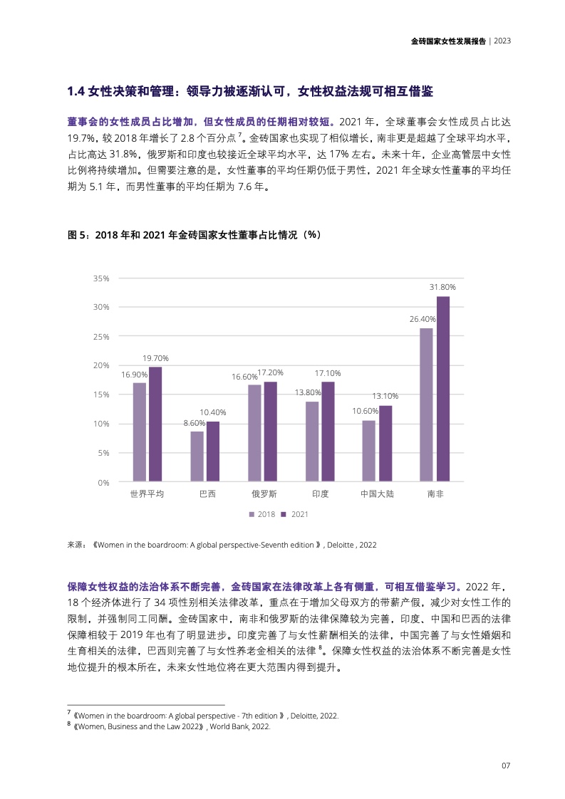 《报告》显示在决策管理方面,金砖国家女性董事的比例有所提升,南非女性董事比例从2019年的26.4%上升至2021年的31.8%,其绝对值和增幅均超过全球平均水平。