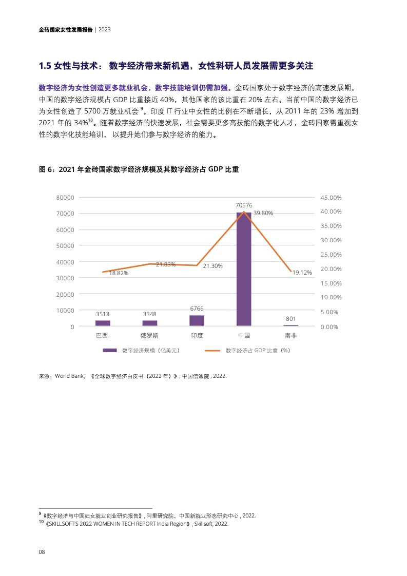 《报告》显示在技术方面,数字经济为金砖国家女性发展带来了更多新机遇,印度IT领域的女性技术人员已达到该领域总就业人数的30%以上;中国的数字经济规模占GDP比重接近40%,为女性创造5700万就业机会。