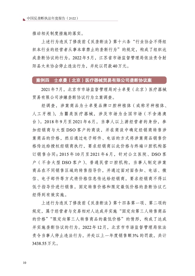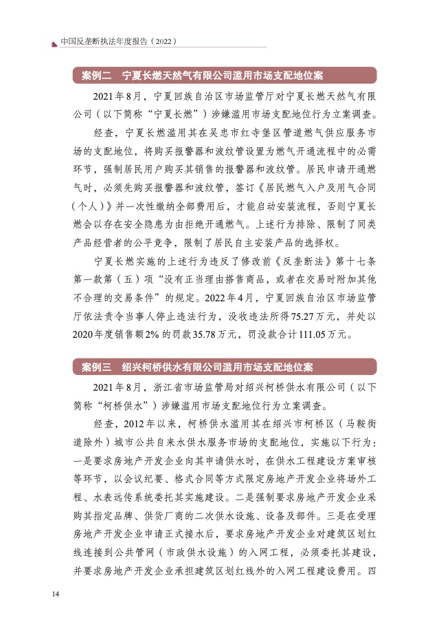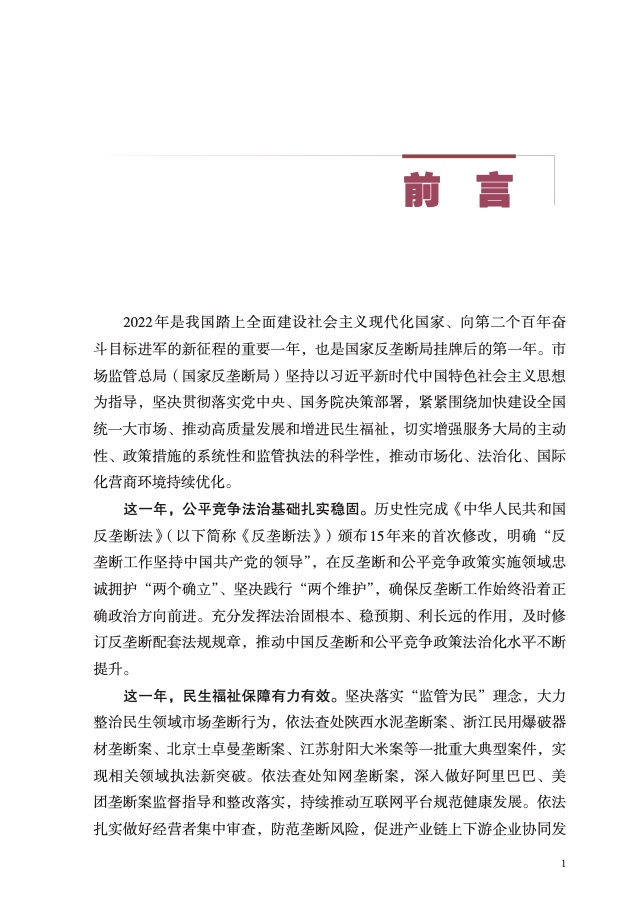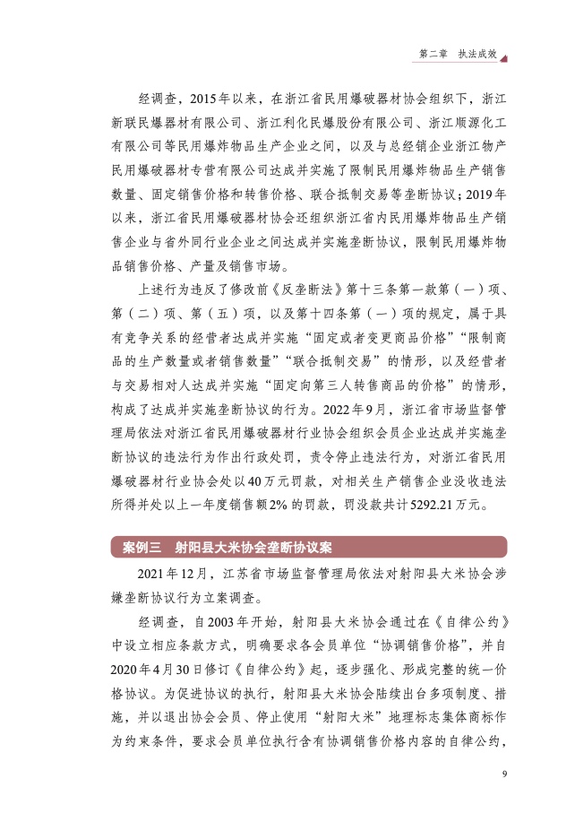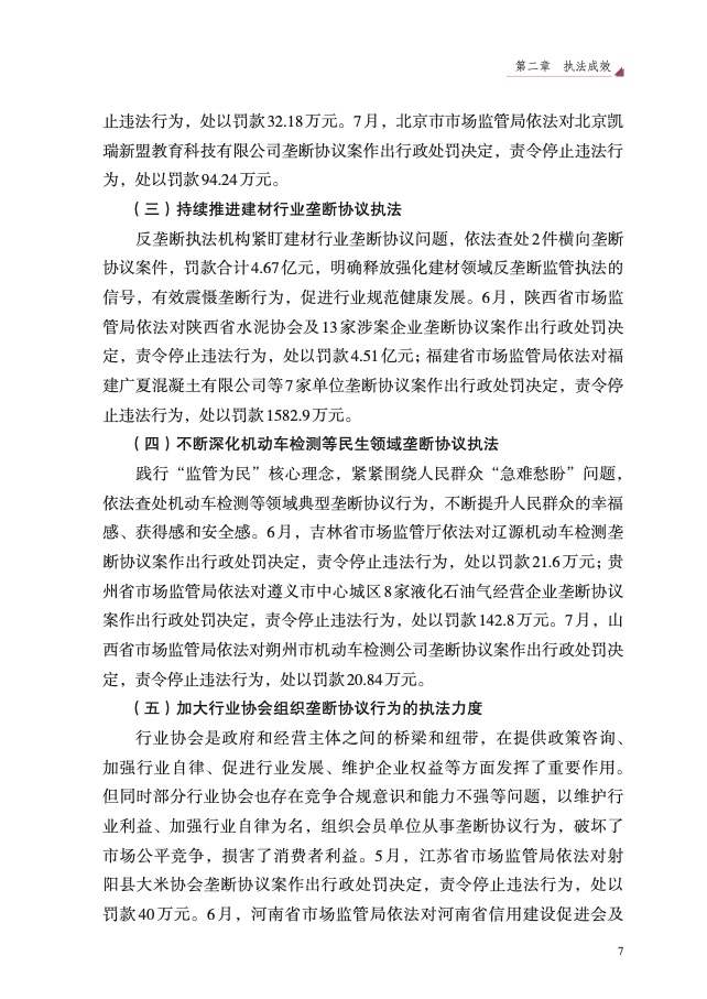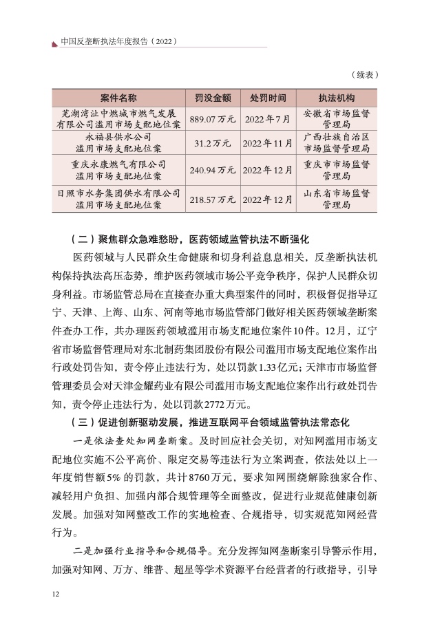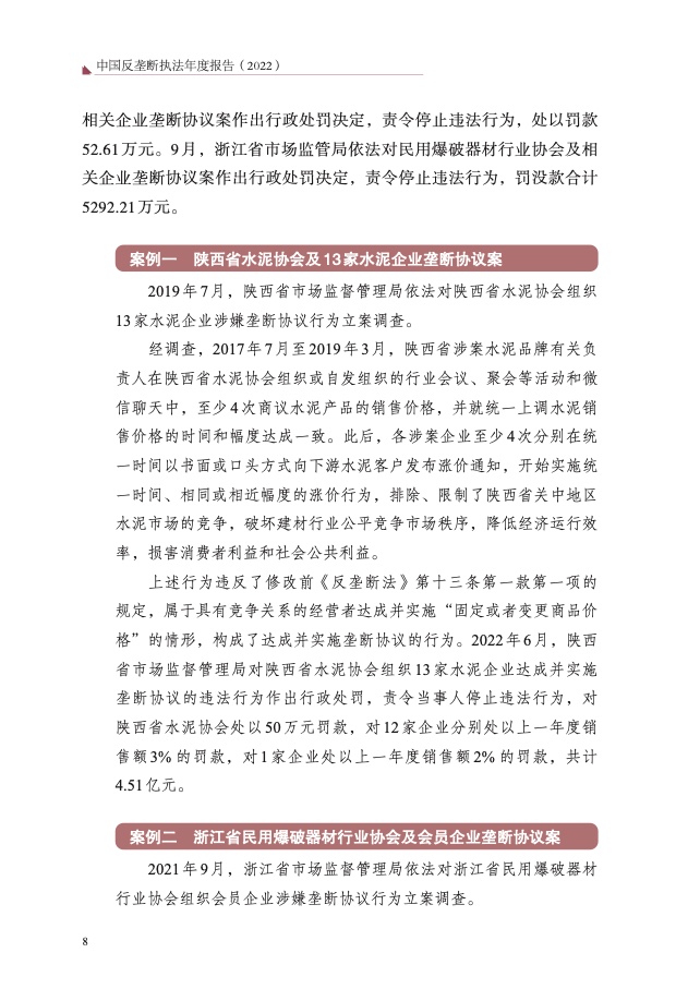 二是重点领域反垄断监管执法力度持续加大。围绕人民群众“急难 愁盼”问题,持续加强医药、公用事业、建材等领域监管执法,查处陕西 水泥垄断案、浙江民爆垄断案、北京士卓曼垄断案等重大典型案件,提高 案件查办质效,坚决维护人民群众切身利益,增强人民群众获得感、幸福 感、安全感。