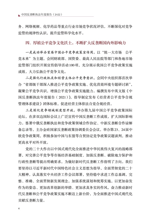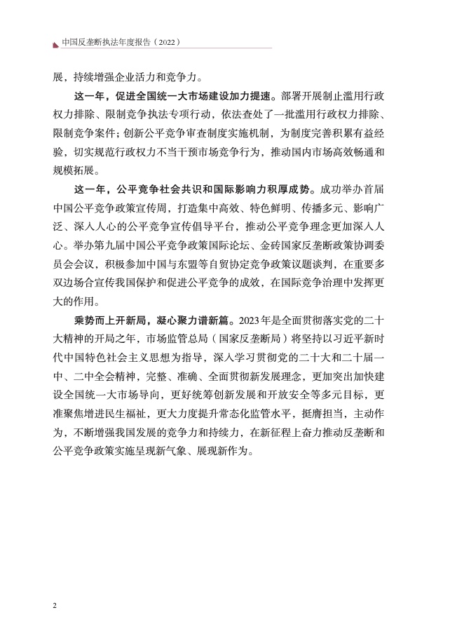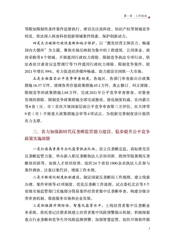 五是全面落实公平竞争审查制度。各地区、各部门审查新出台政策 措施 16.37 万件,清理各类存量政策措施 45.2 万件,废止修订、纠正排除、 限制竞争的政策措施 2.04 万件。完成 2021 年公平竞争审查督查,对督查 发现的排除、限制竞争政策措施全部完成整改,强化制度权威。在内蒙古 等 6 省(区、市)首次开展国家层面公平竞争审查第三方评估,在天津等 9 省(市)开展重大政策措施会审等 4 项试点,为创新完善制度设计提供 有力支撑。