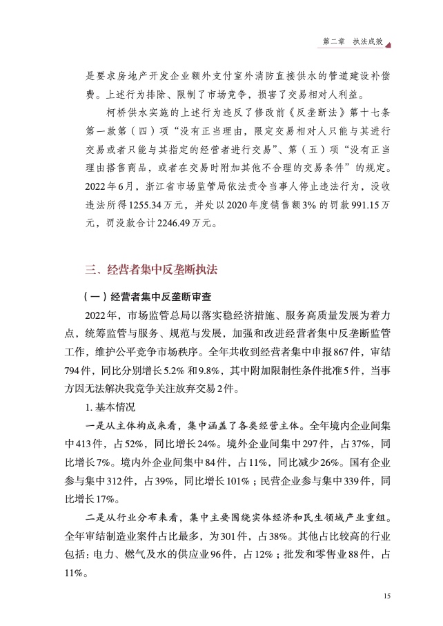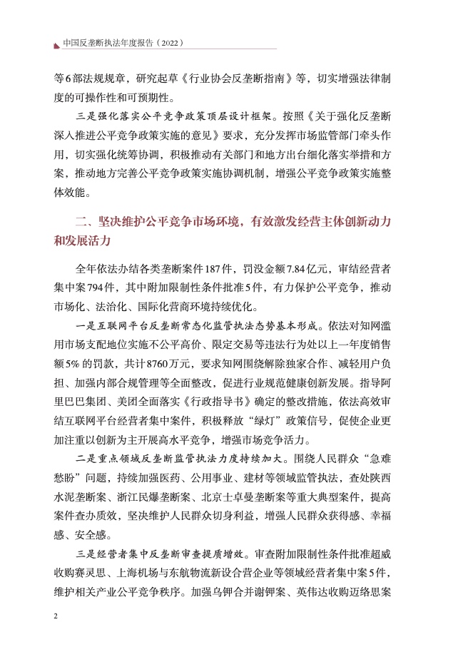 全年依法办结各类垄断案件 187 件,罚没金额 7.84 亿元,审结经营者 集中案 794 件,其中附加限制性条件批准 5 件,有力保护公平竞争,推动 市场化、法治化、国际化营商环境持续优化。