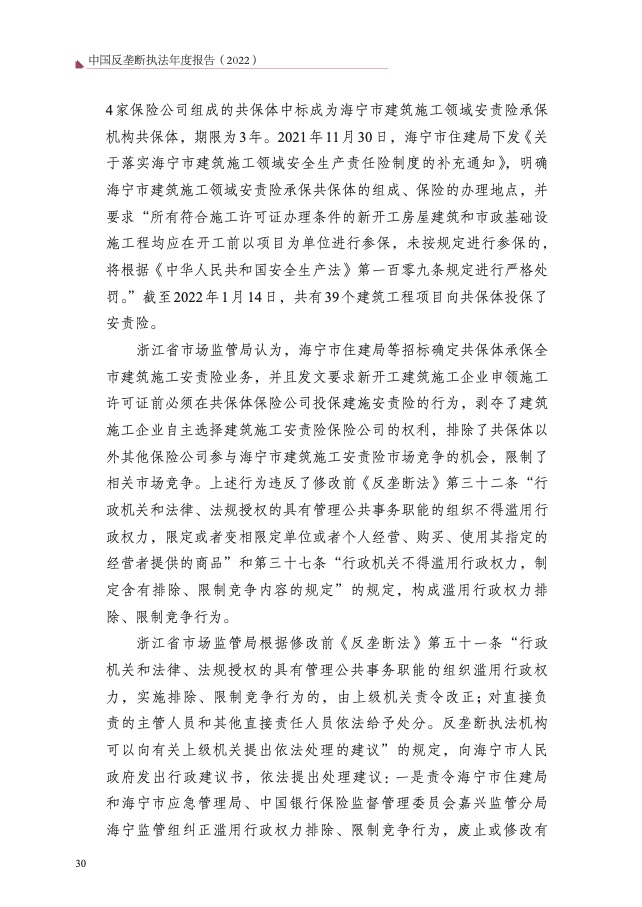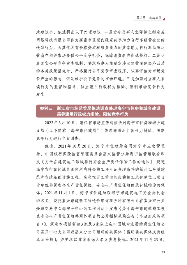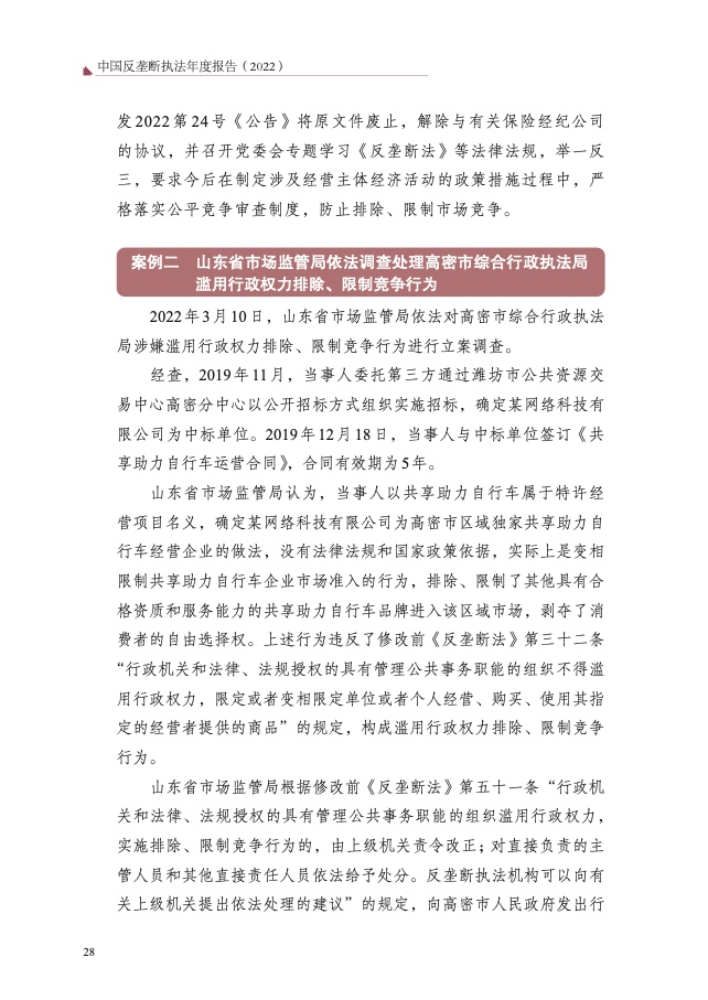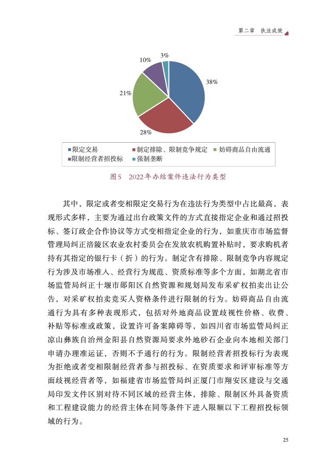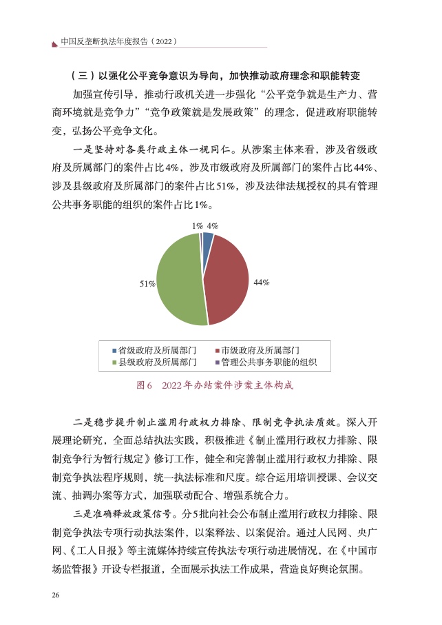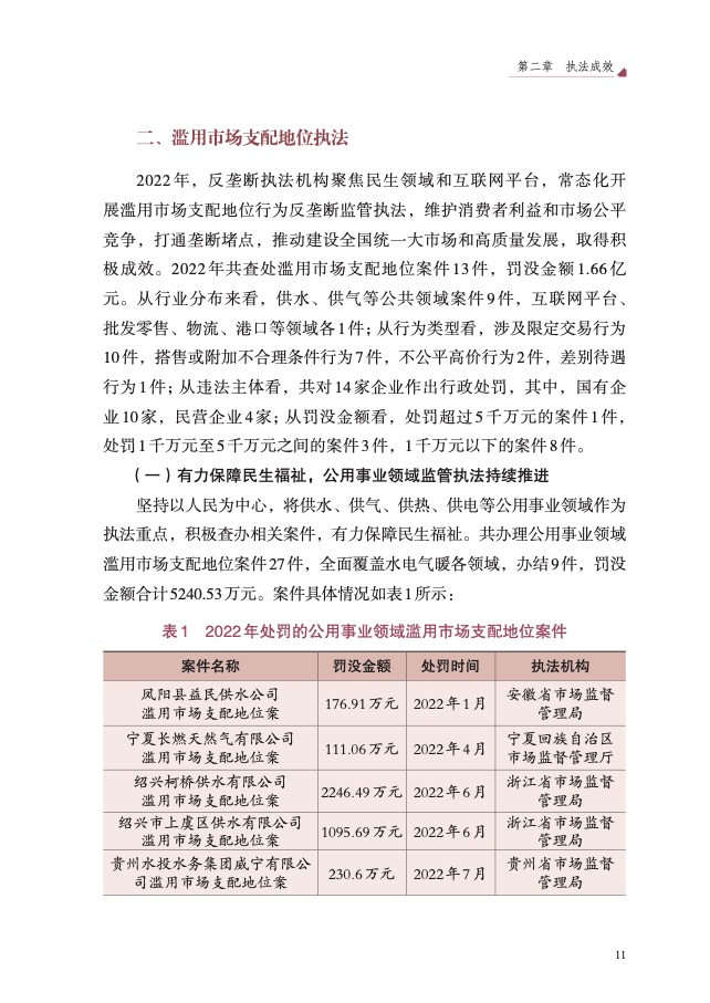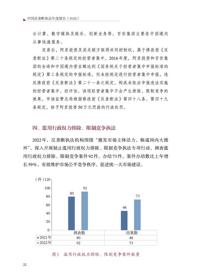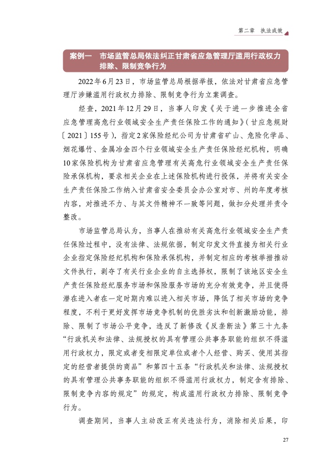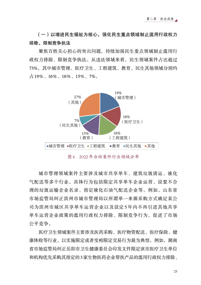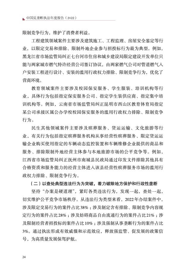 四是大力破除行政性垄断和地方保护。以“激发经营主体活力、畅通 国内大循环”为主题,聚焦市场反映较为集中的工程建筑、公用事业、政 府采购等 8 个领域,开展滥用行政权力排除、限制竞争执法专项行动,依 法查处甘肃省应急管理厅等 73 件滥用行政权力排除、限制竞争案件,较 2021 年增长 59%,有力促进经济循环畅通,助力建设全国统一大市场。