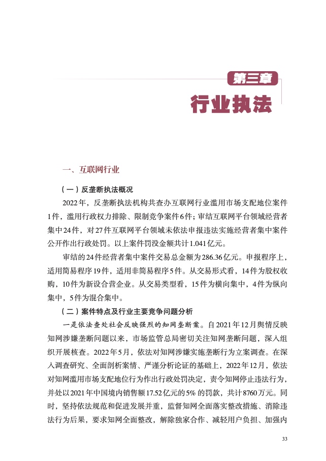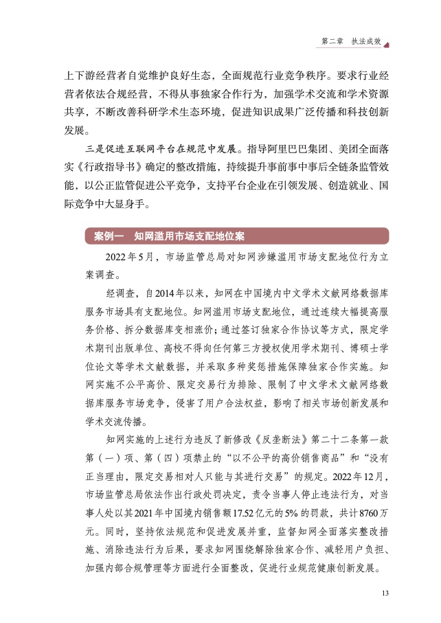 一是互联网平台反垄断常态化监管执法态势基本形成。依法对知网滥 用市场支配地位实施不公平高价、限定交易等违法行为处以上一年度销售 额 5% 的罚款,共计 8760 万元,要求知网围绕解除独家合作、减轻用户负 担、加强内部合规管理等全面整改,促进行业规范健康创新发展。指导阿 里巴巴集团、美团全面落实《行政指导书》确定的整改措施,依法高效审 结互联网平台经营者集中案件,积极释放“绿灯”政策信号,促使企业更 加注重以创新为主开展高水平竞争,增强市场竞争活力。
