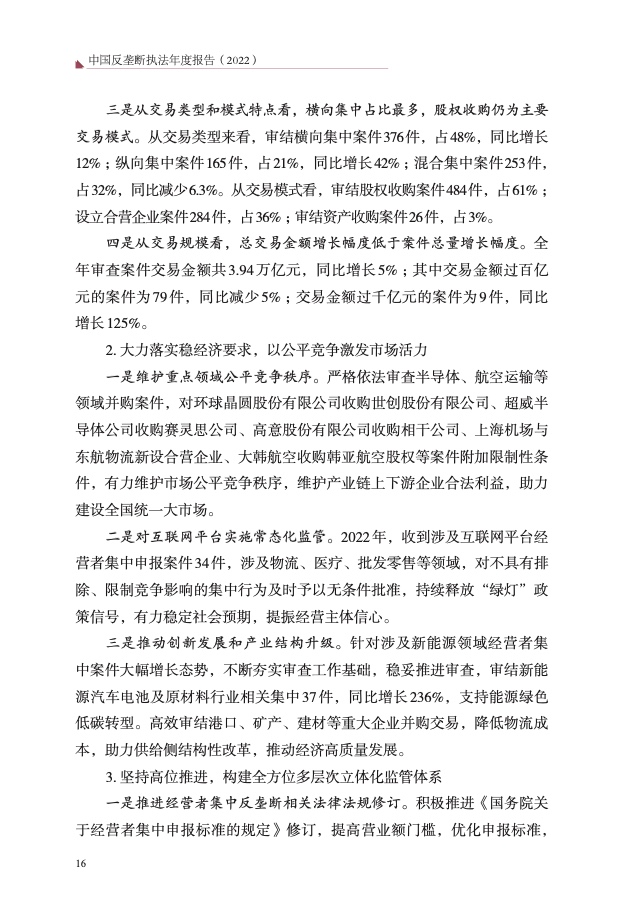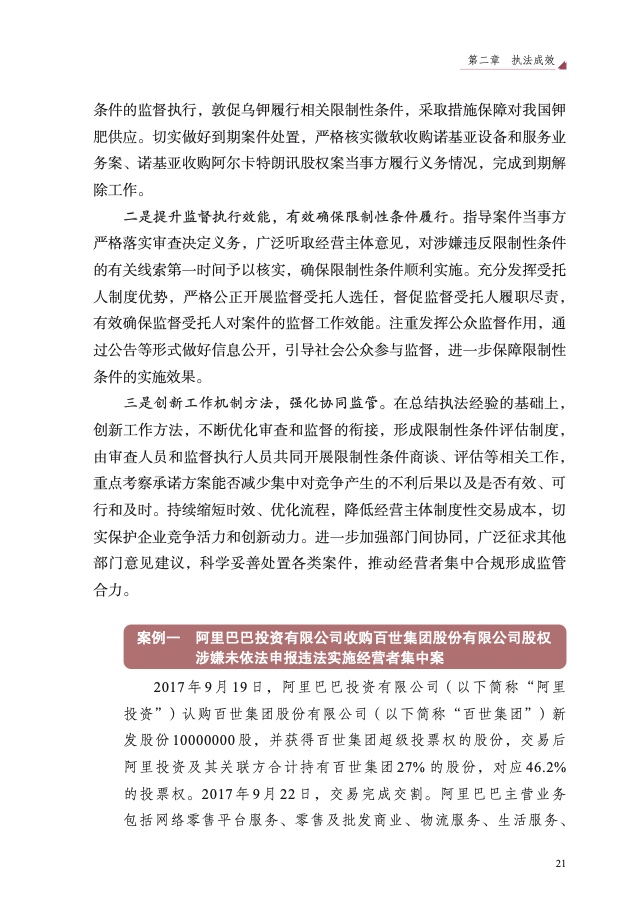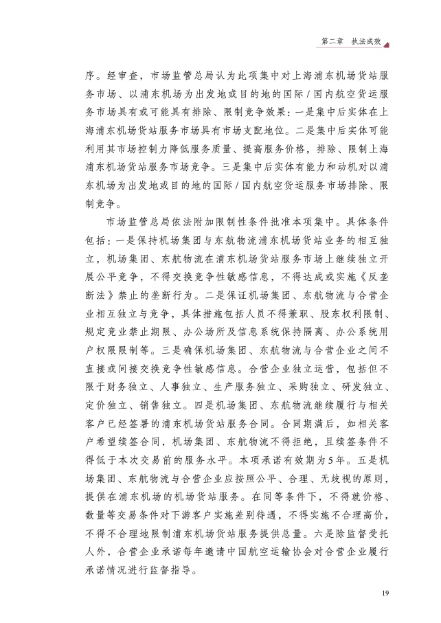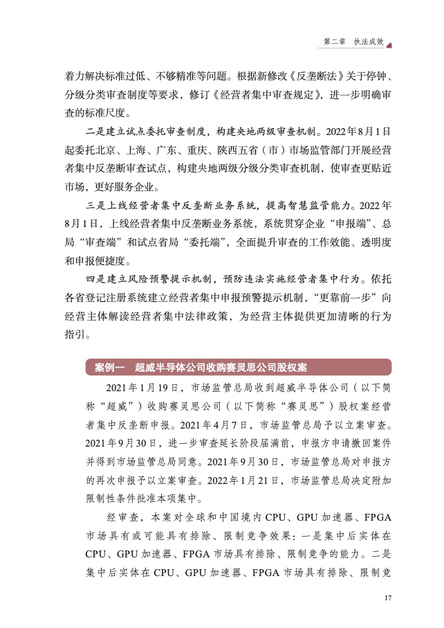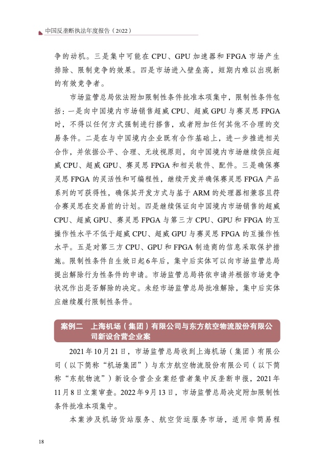 三是经营者集中反垄断审查提质增效。审查附加限制性条件批准超威 收购赛灵思、上海机场与东航物流新设合营企业等领域经营者集中案 5 件, 维护相关产业公平竞争秩序。加强乌钾合并谢钾案、英伟达收购迈络思案