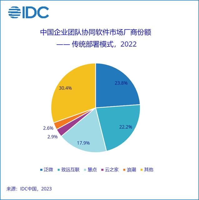 在传统部署模式市场中,排名前五的厂商占据整个市场69.6%的份额。泛微以23.8%的市场份额排名第一,搭建了覆盖大、中、小型各类规模组织的全系列协同管理产品线;致远互联以22.2%的市场份额排名第二,坚持“平台化和生态化”的发展战略,构建从到协同办公到协同运营的一体化解 决方案,深耕企业及政务两大市场客户;慧点科技主要服务于党政及大型集团型企业,打造智能极简的数字化协同办公平台,以17.9%的市场份额排在第三位。