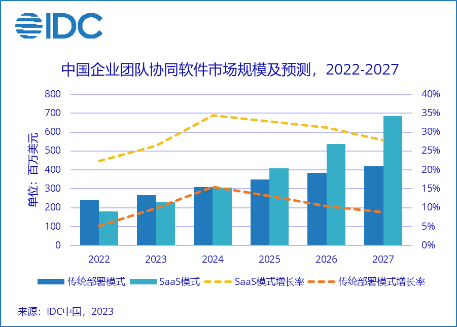 近日,IDC发布了《中国企业团队协同软件市场半年跟踪报告,2022》。数据显示,2022年中国企业团队协同软件市场规模为4.2亿美元,同比增长12%。其中,本地部署模式的企业团队协同软件规模为2.4亿美元,同比增长5.2%;SaaS模式的企业团队协同软件规模为1.8亿美元,同比增长22.4%。IDC预测,2022-2027年企业团队协同软件市场的复合增长率为21.1%,其中企业团队协同SaaS市场的复合增长率为30.5%,本地部署模式的企业团队协同软件未来5年的复合增长率仅为SaaS模式的三分之一。