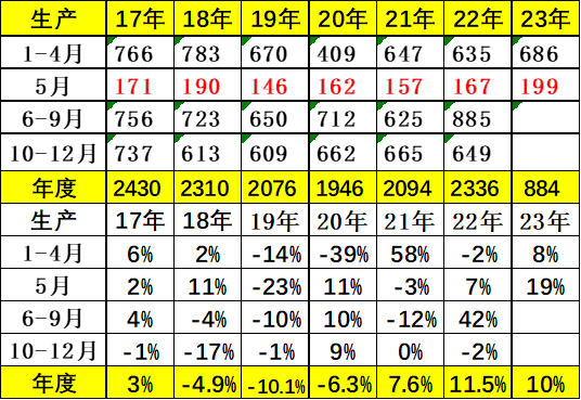 去年5月是渠道小幅去库存时期,今年情况部分主力车企产销谨慎,5月持续降低渠道库存以保安全。