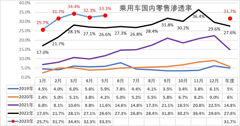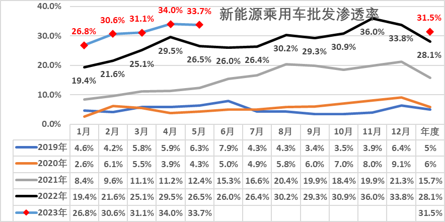 5月新能源车厂商批发渗透率33.7%,较2022年5月26.5%的渗透率提升7.2个百分点。