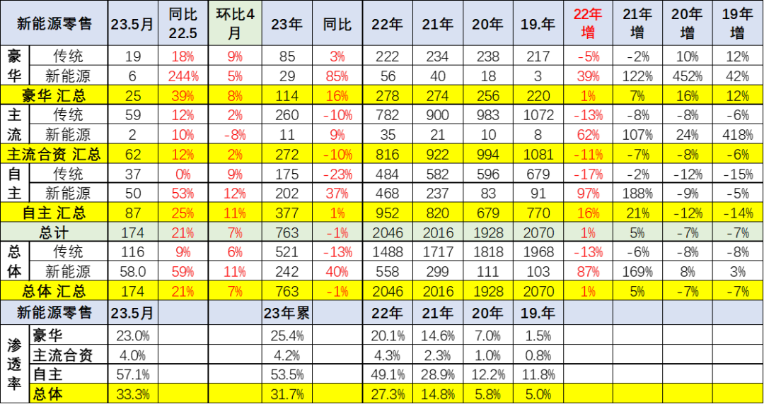 5月,自主品牌中的新能源车渗透率57.1%;豪华车中的新能源车渗透率23.0%;而主流合资品牌中的新能源车渗透率仅有4.0%。