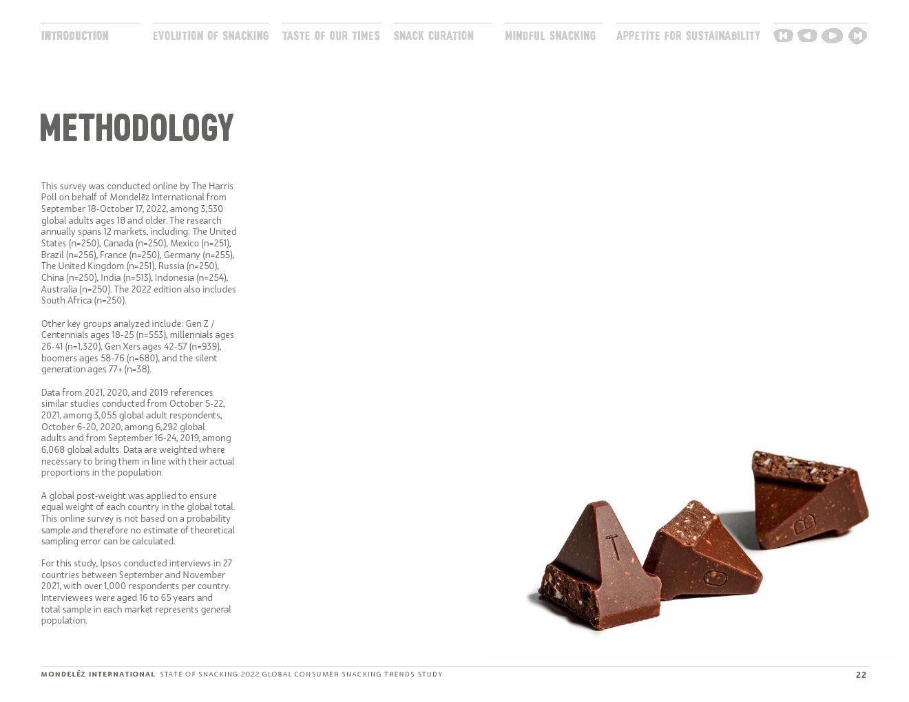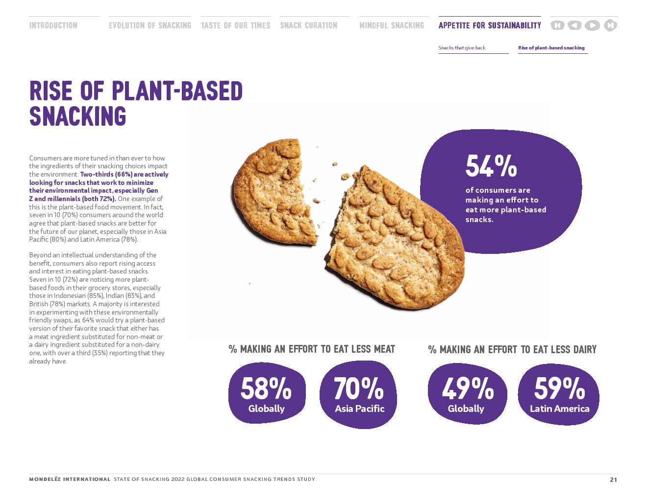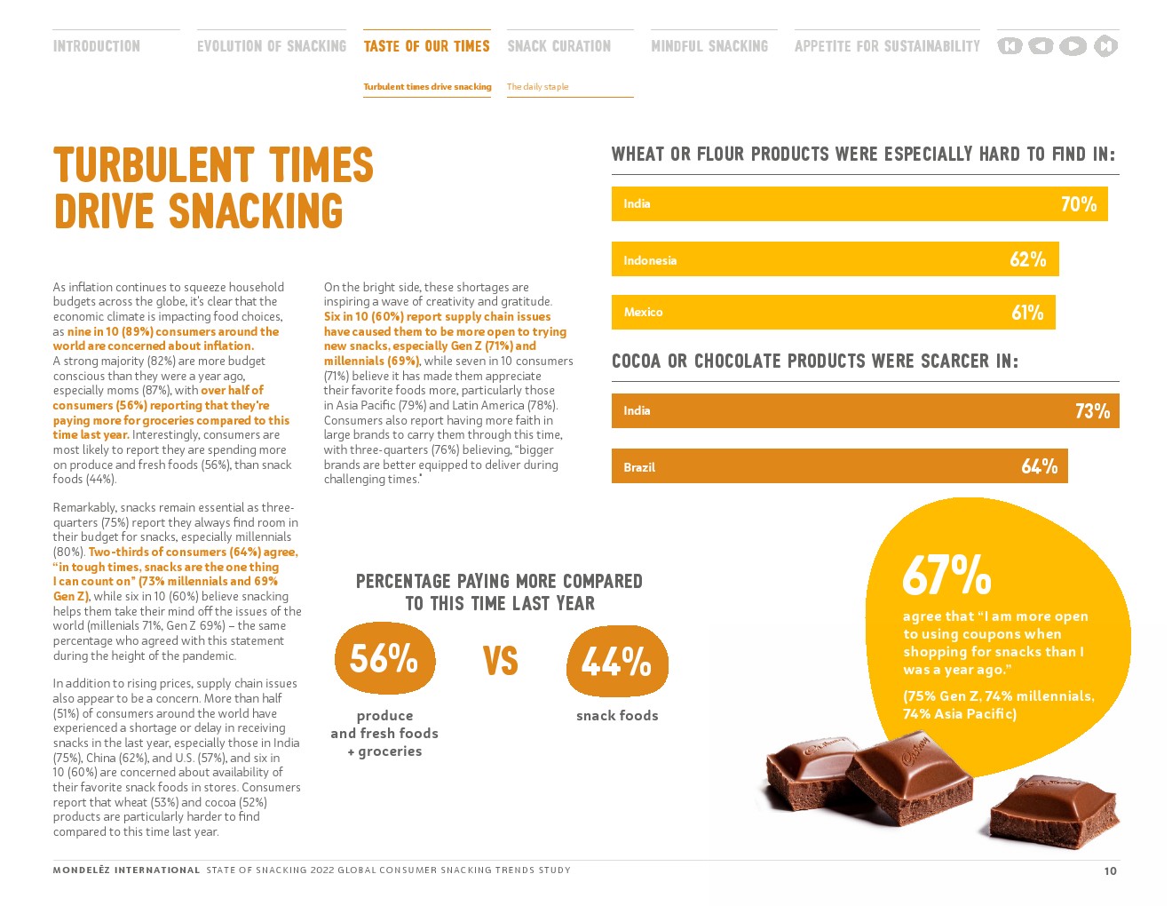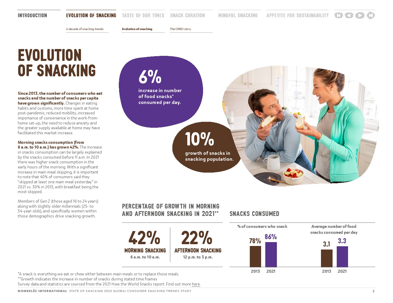 Mondelez发布了“2022年全球零食报告”,这是第四个年度报告。零食继续满足消费者生活中越来越多的需求,放纵仍然是平衡生活方式中受欢迎的一部分。事实上,全球78%的消费者表示,“如今,在一天中享受片刻比以往任何时候都更重要。”尽管杂货成本不断上涨,但75%的消费者表示,他们总能在预算中找到购买零食的空间,尤其是千禧一代(80%)。