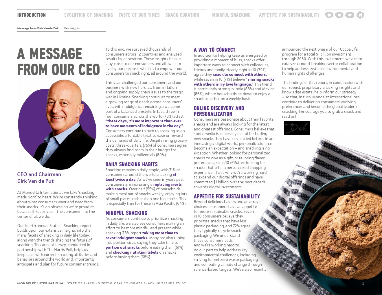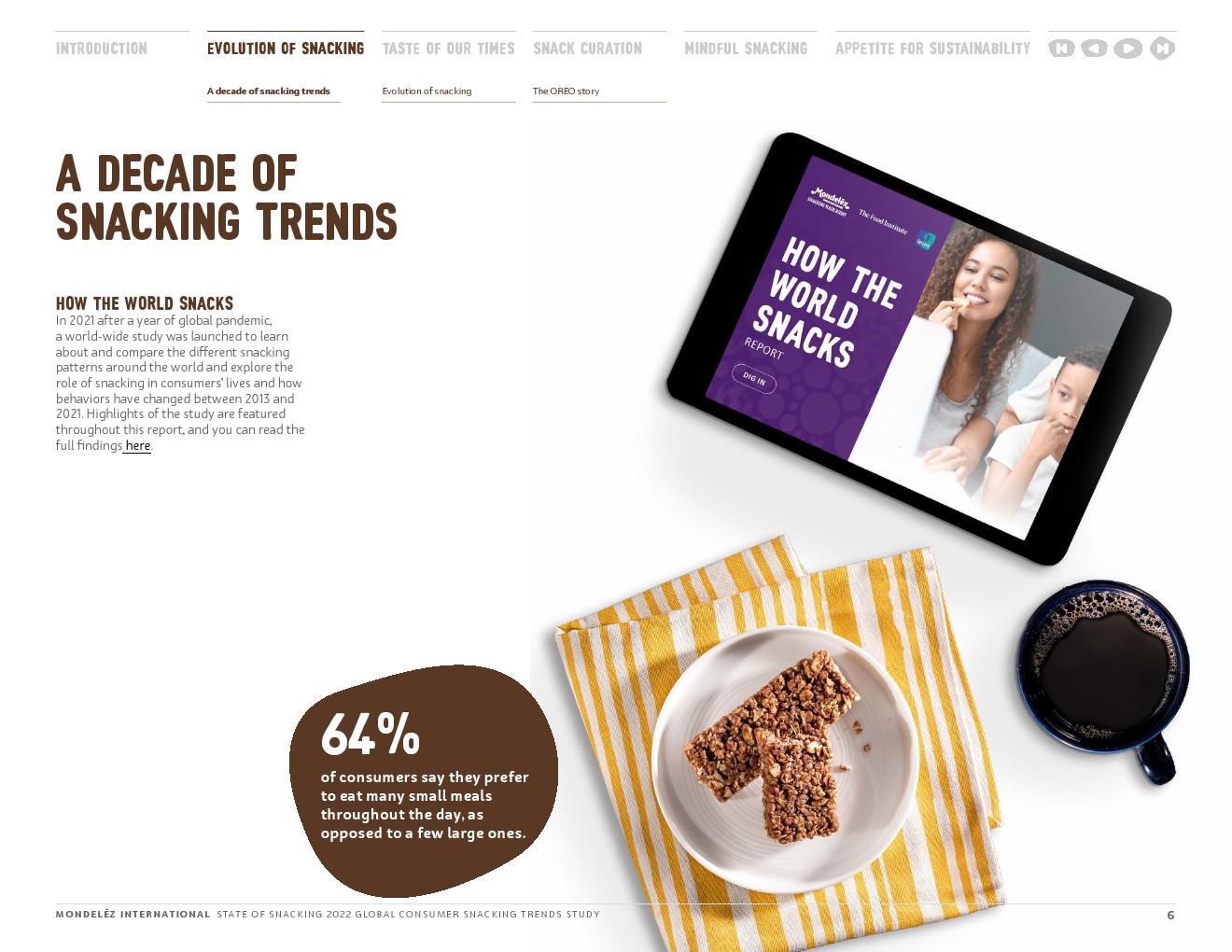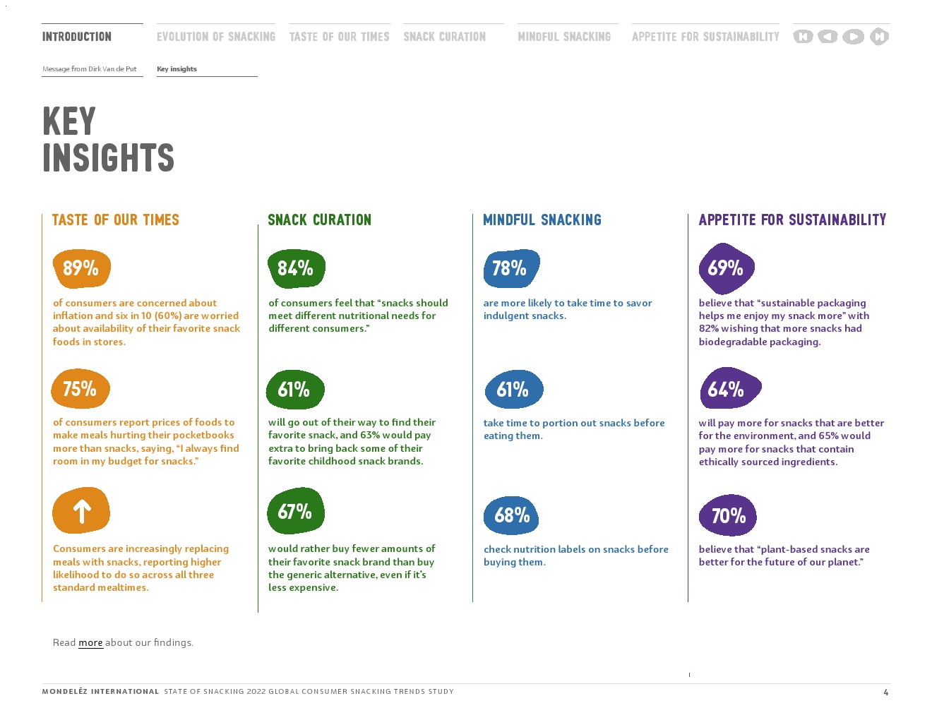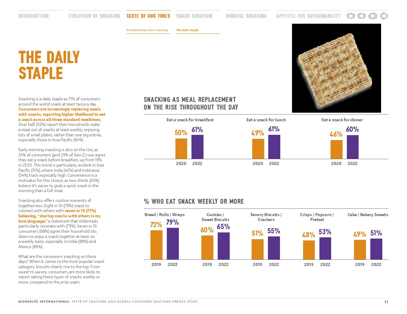 Mondelez发布了“2022年全球零食报告”,这是第四个年度报告。零食继续满足消费者生活中越来越多的需求,放纵仍然是平衡生活方式中受欢迎的一部分。事实上,全球78%的消费者表示,“如今,在一天中享受片刻比以往任何时候都更重要。”尽管杂货成本不断上涨,但75%的消费者表示,他们总能在预算中找到购买零食的空间,尤其是千禧一代(80%)。