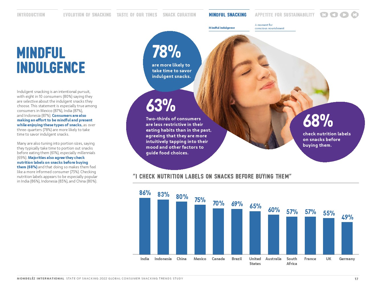 78%的人会花更多的时间来品尝放纵的零食。许多人还会关注零食的份量,61%的消费者说他们在吃零食之前会花时间来分配零食,68%的人在买零食之前会检查零食上的营养标签。