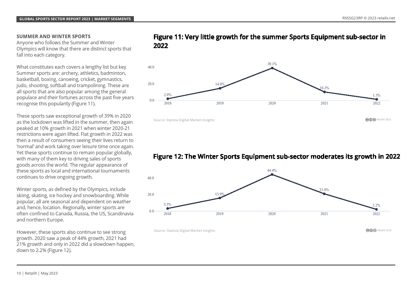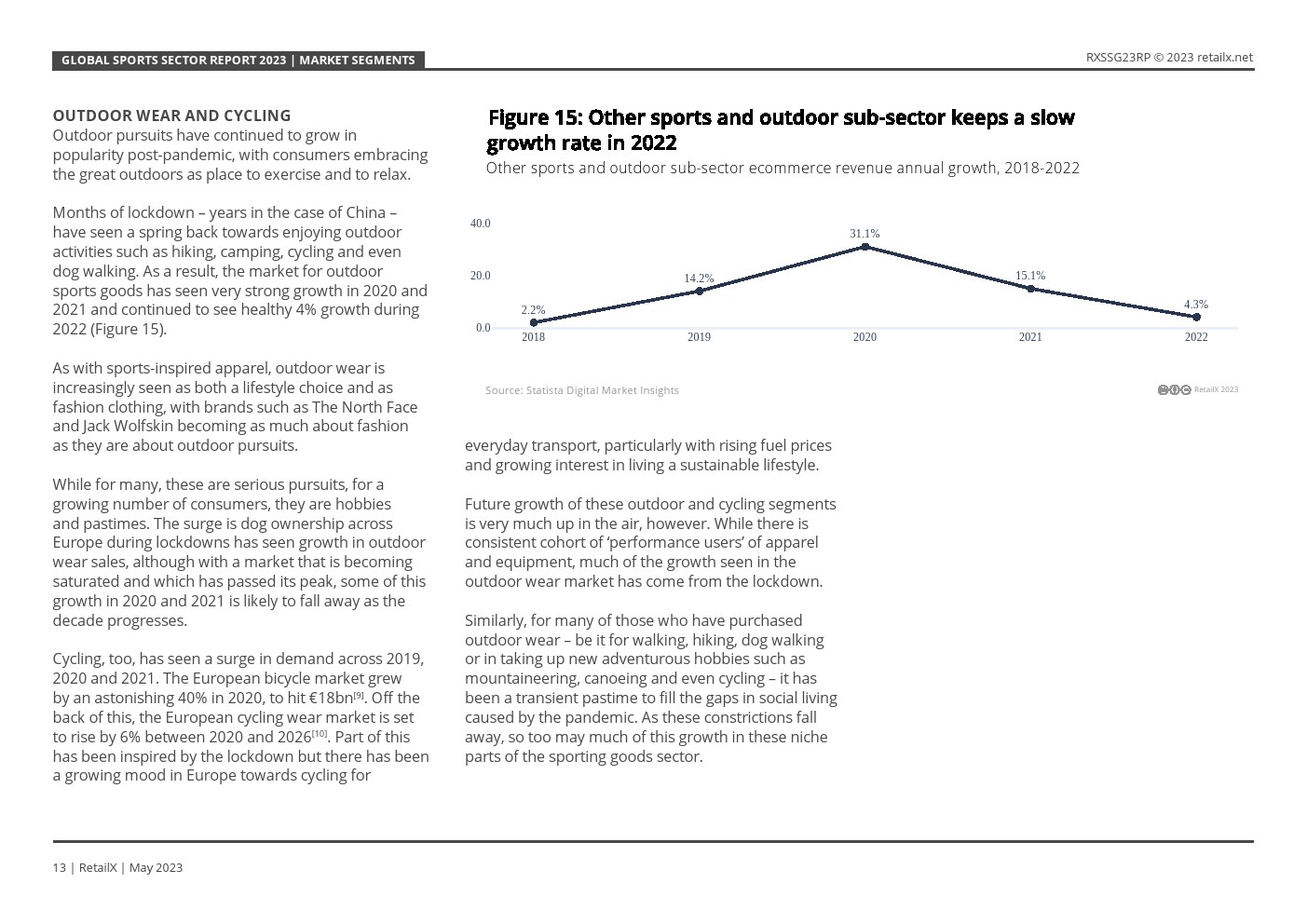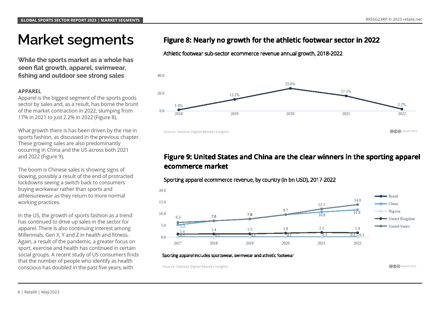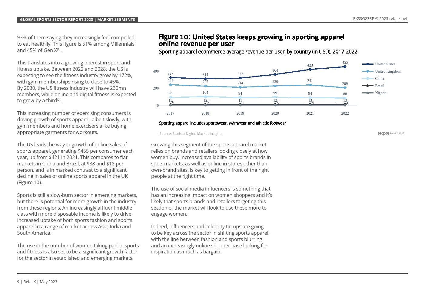 报告还探索了更多地使用科技来参与竞争的产品,并为运动和健身添加其他维度,吸引新的、年轻的用户,他们寻求更有趣、社交和沉浸式的体验。运动服装在时尚界的持续和日益提高的影响也将继续成为该行业的福音,即使在这些充满挑战的时期,这一行业仍在保持增长。
