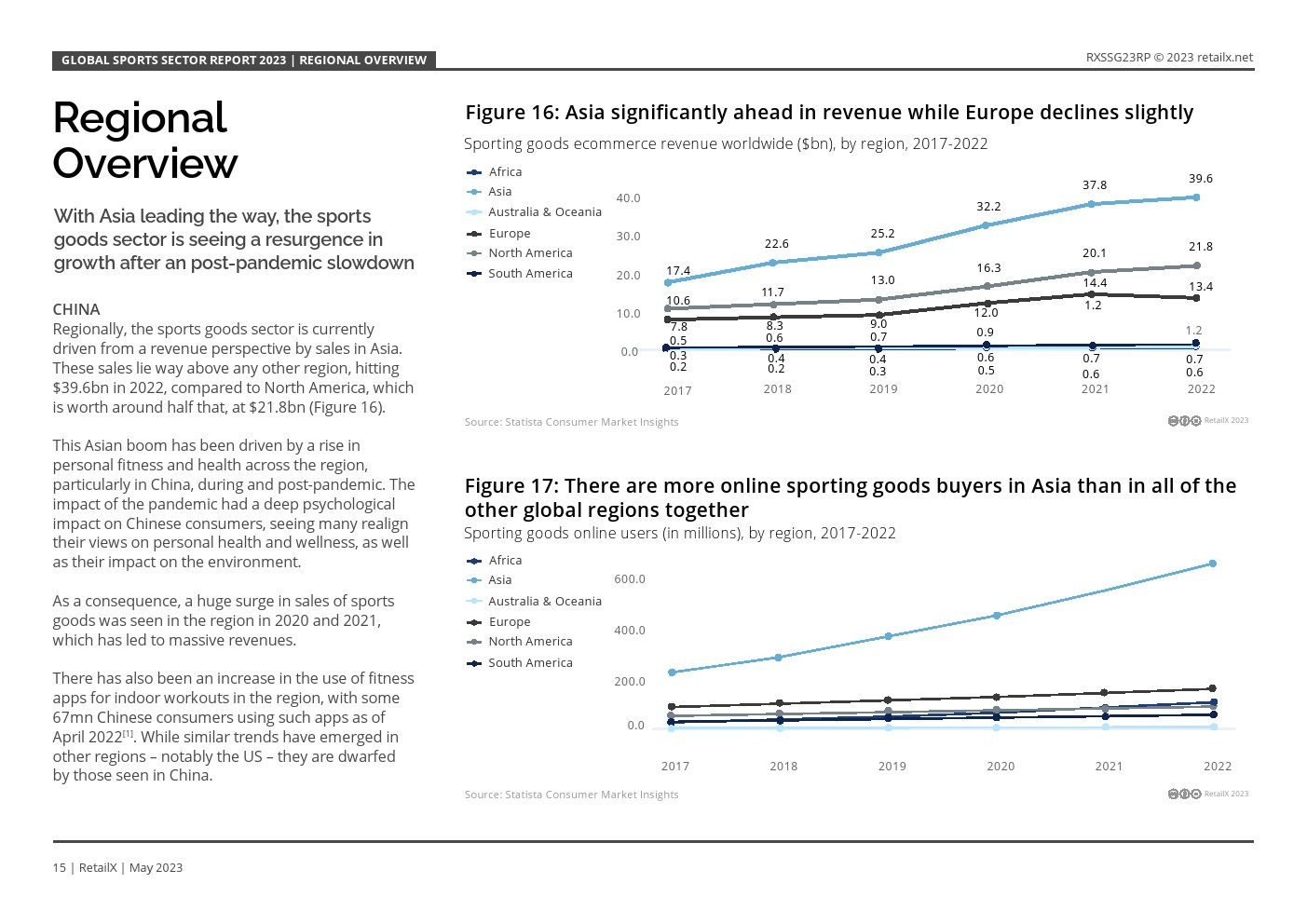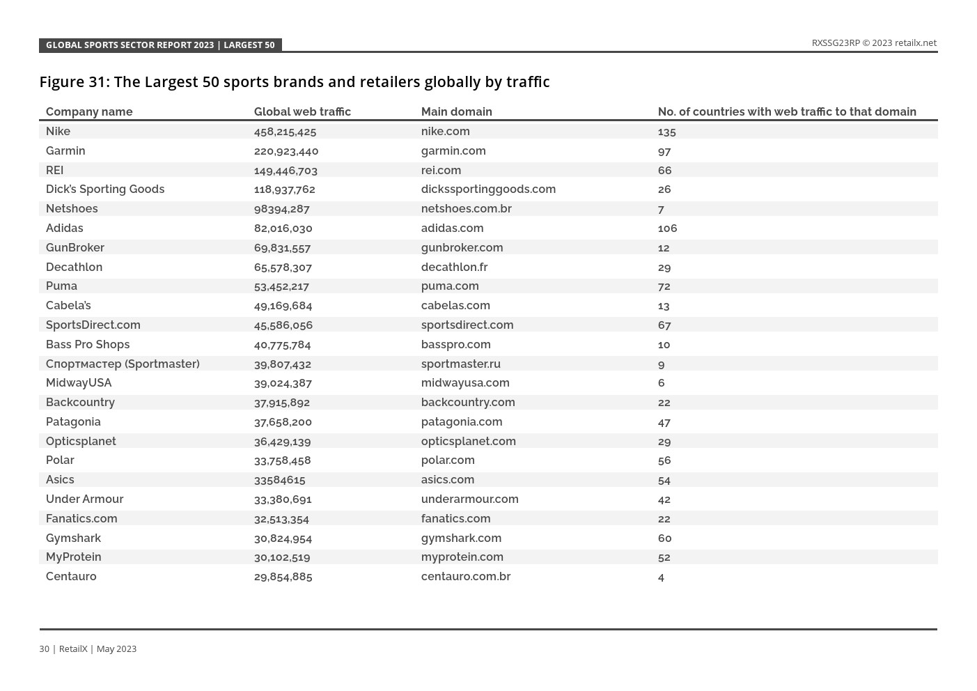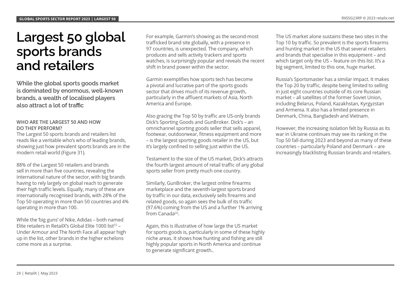 报告列出了全球最大的50家运动品牌和零售商,以及其业绩。虽然全球体育用品市场由巨大的知名品牌主导,但大量的本地化品牌也吸引了大量流量。