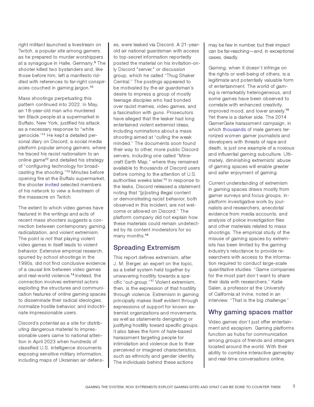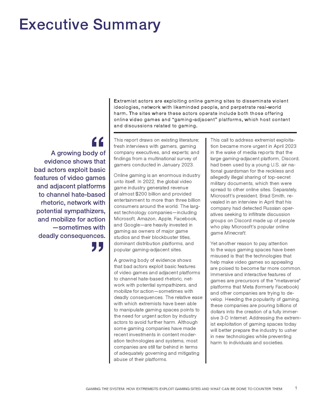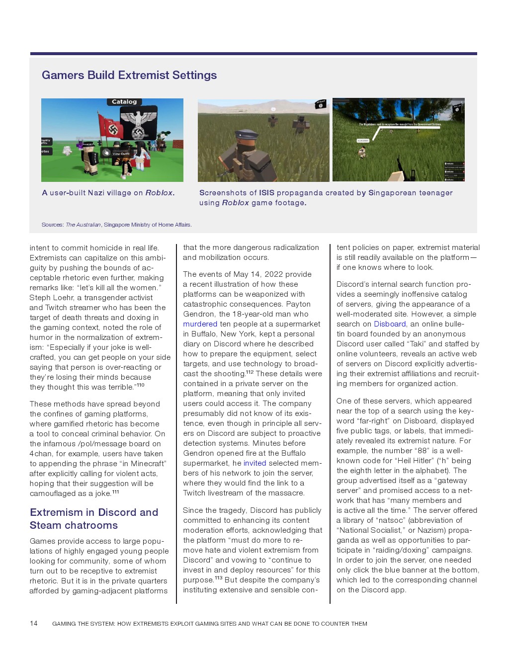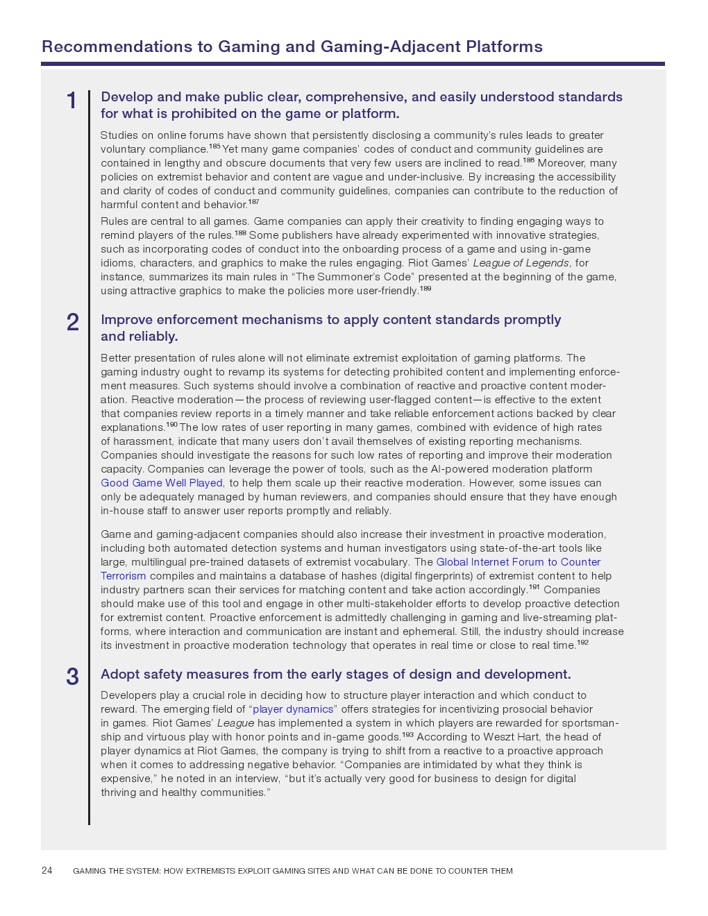 越来越多的证据表明,不良行为者利用电子游戏和相关平台的基本特征,传播基于仇恨的言论,与潜在的同情者建立联系,并动员采取行动,有时会带来致命的后果。极端分子能够相对轻松地操纵游戏空间,这表明行业参与者需要采取紧急行动,以避免进一步的伤害。尽管一些游戏公司最近已经投资了内容审核技术和系统,但大多数公司在适当管理和减少平台滥用方面仍然远远落后。