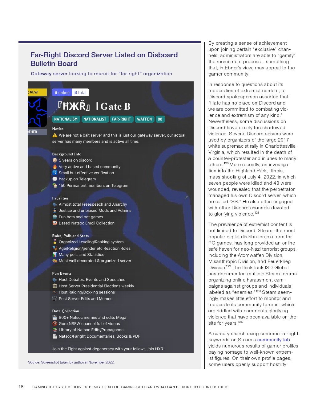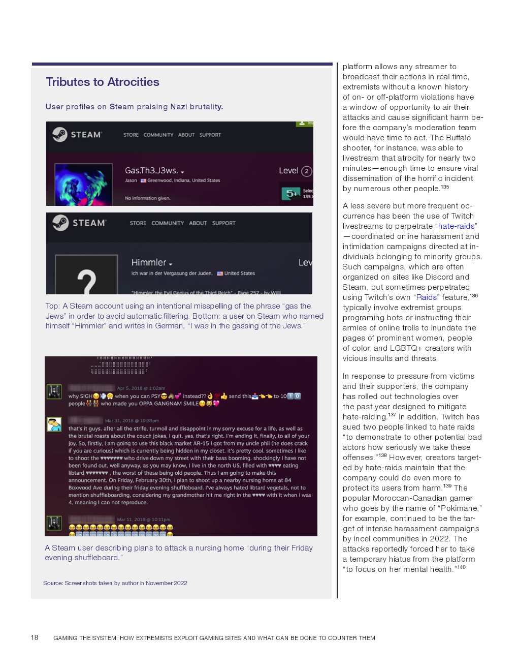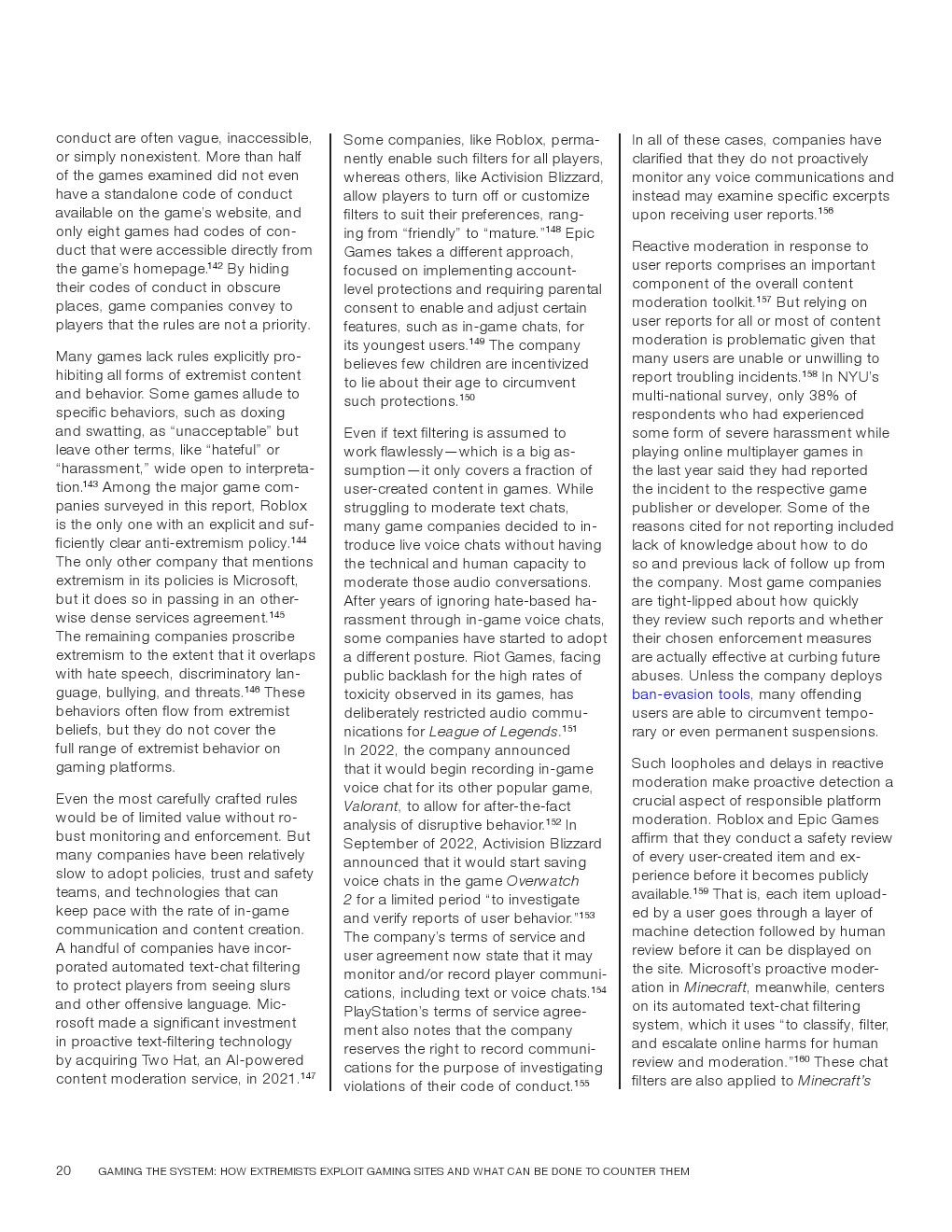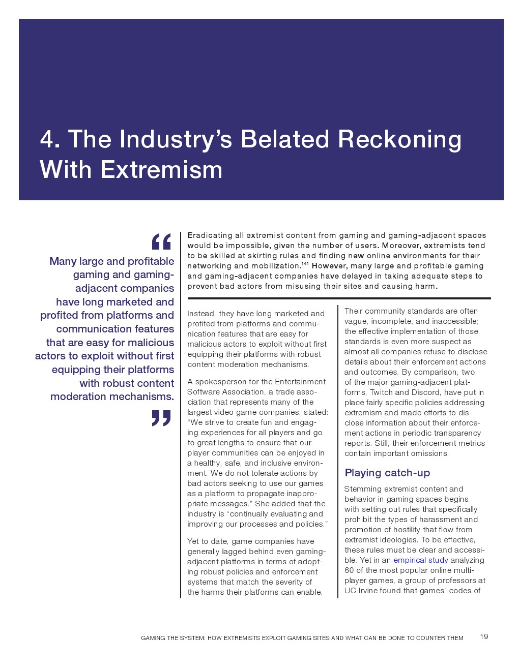 越来越多的证据表明,不良行为者利用电子游戏和相关平台的基本特征,传播基于仇恨的言论,与潜在的同情者建立联系,并动员采取行动,有时会带来致命的后果。极端分子能够相对轻松地操纵游戏空间,这表明行业参与者需要采取紧急行动,以避免进一步的伤害。尽管一些游戏公司最近已经投资了内容审核技术和系统,但大多数公司在适当管理和减少平台滥用方面仍然远远落后。