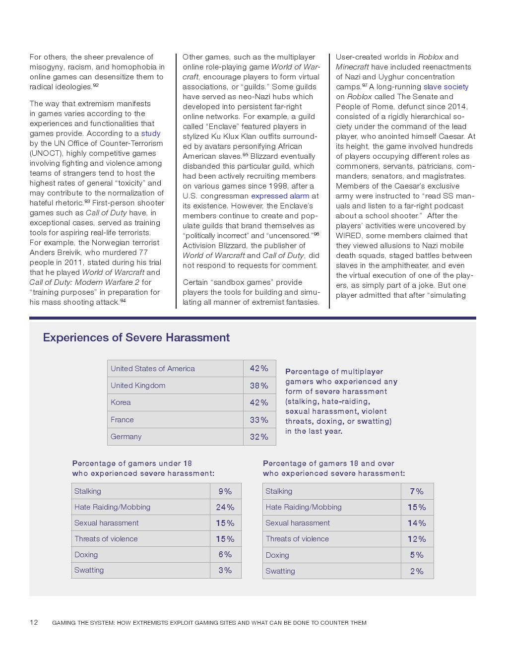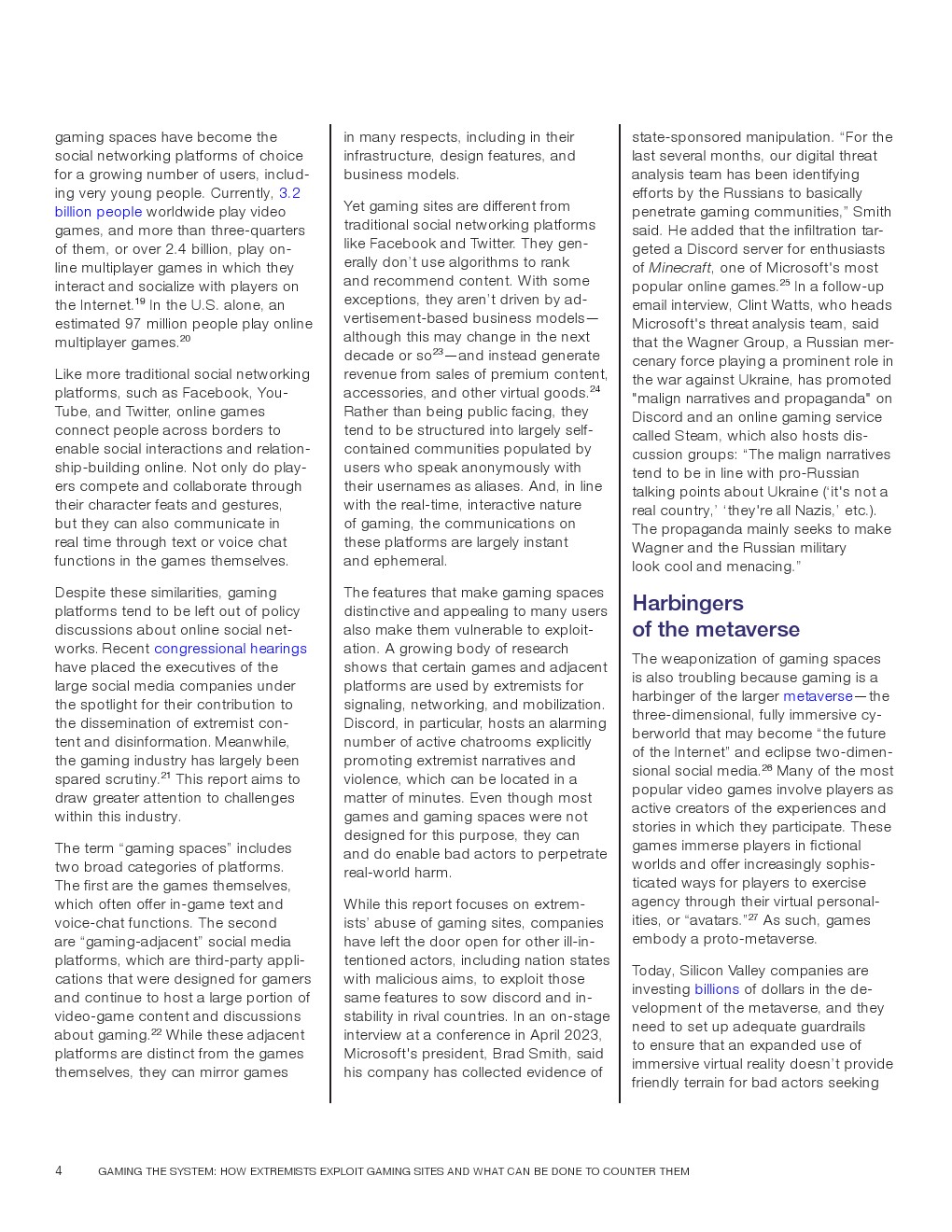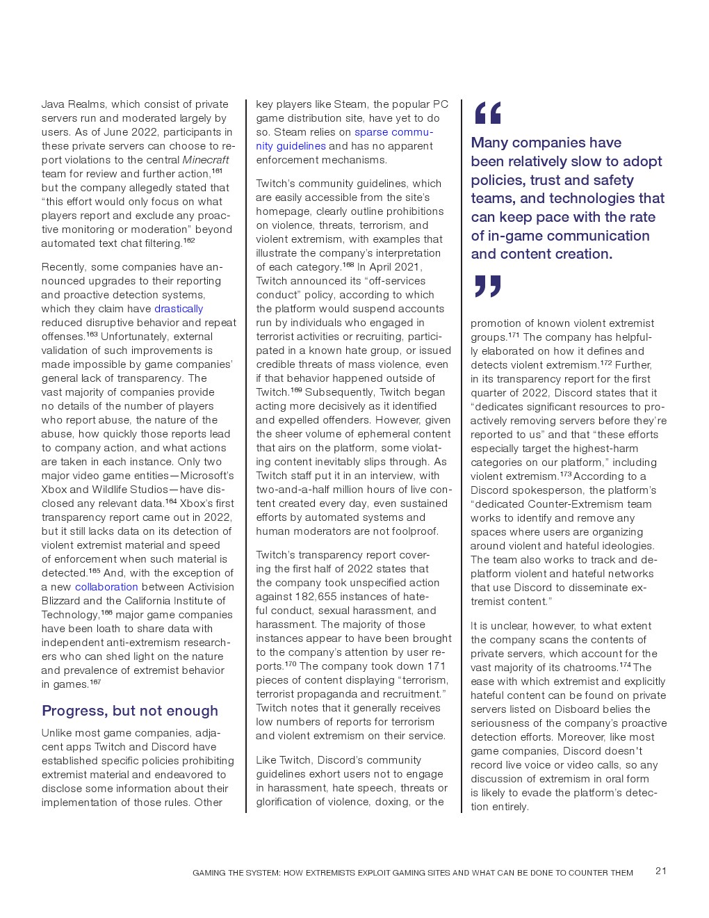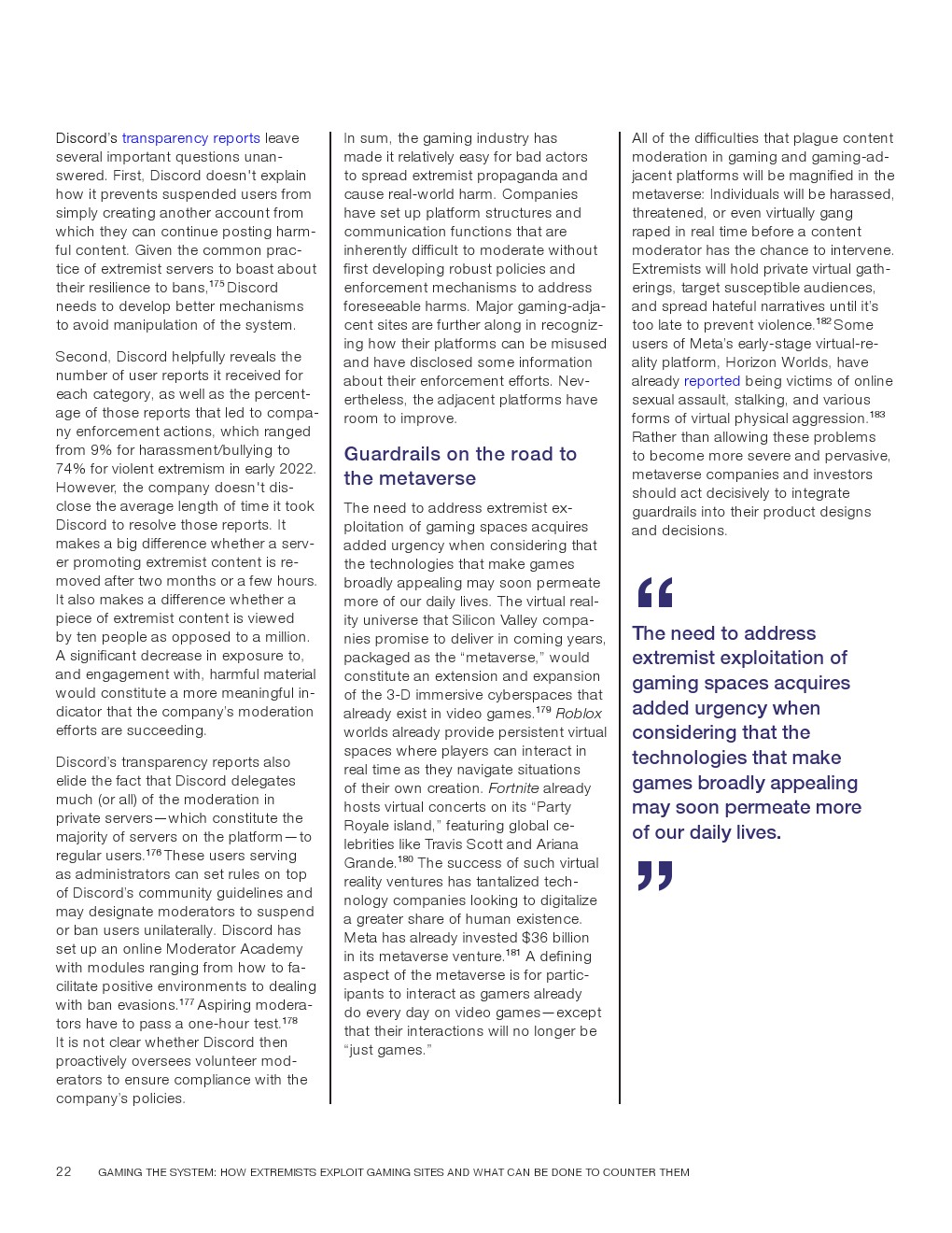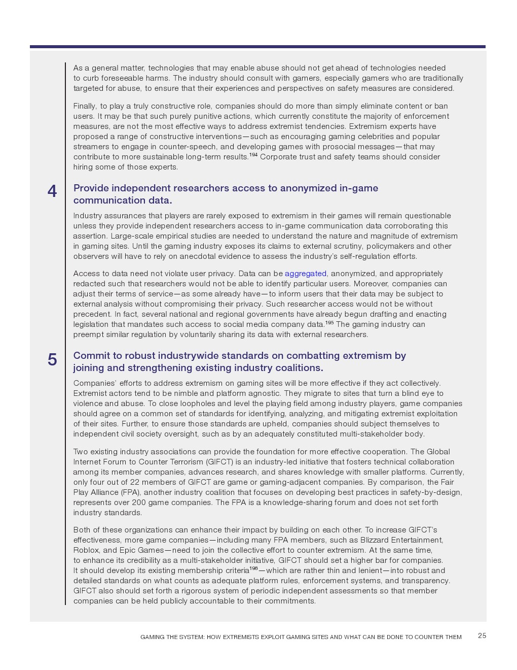 越来越多的证据表明,不良行为者利用电子游戏和相关平台的基本特征,传播基于仇恨的言论,与潜在的同情者建立联系,并动员采取行动,有时会带来致命的后果。极端分子能够相对轻松地操纵游戏空间,这表明行业参与者需要采取紧急行动,以避免进一步的伤害。尽管一些游戏公司最近已经投资了内容审核技术和系统,但大多数公司在适当管理和减少平台滥用方面仍然远远落后。