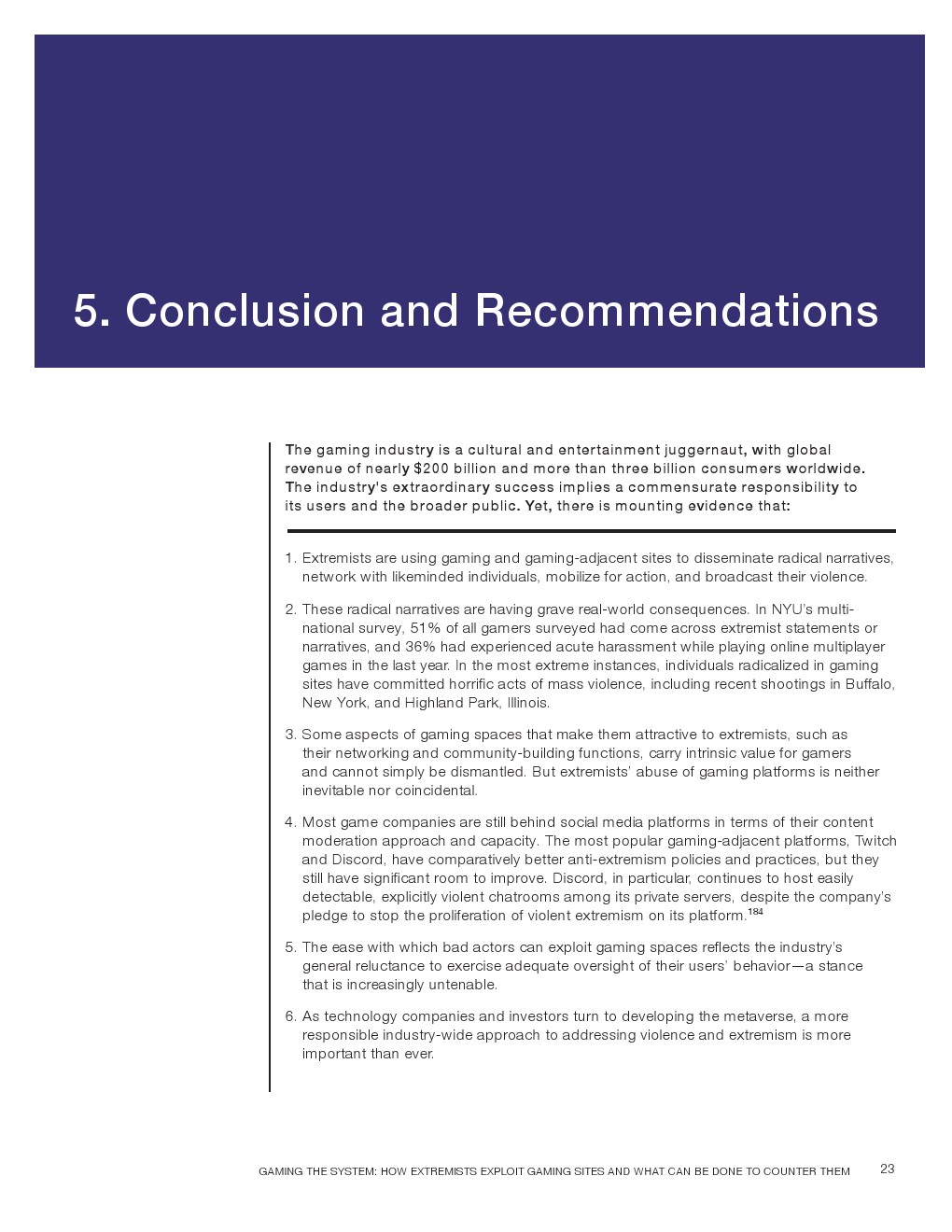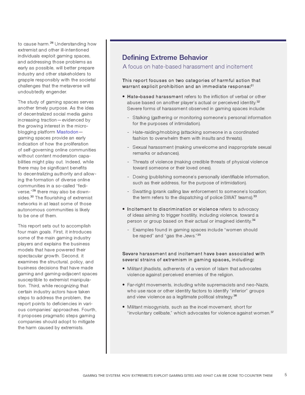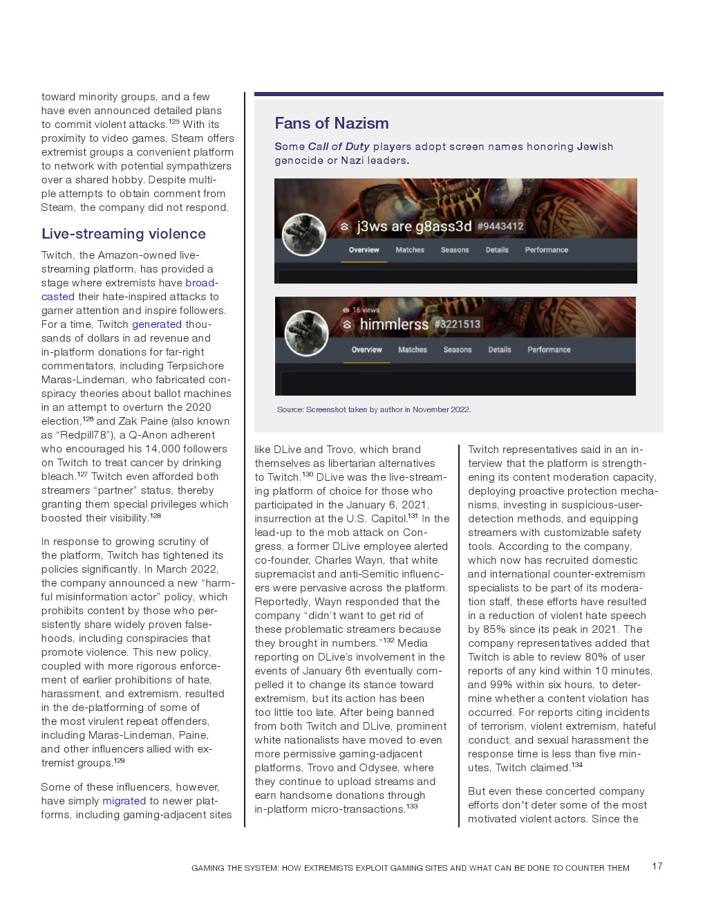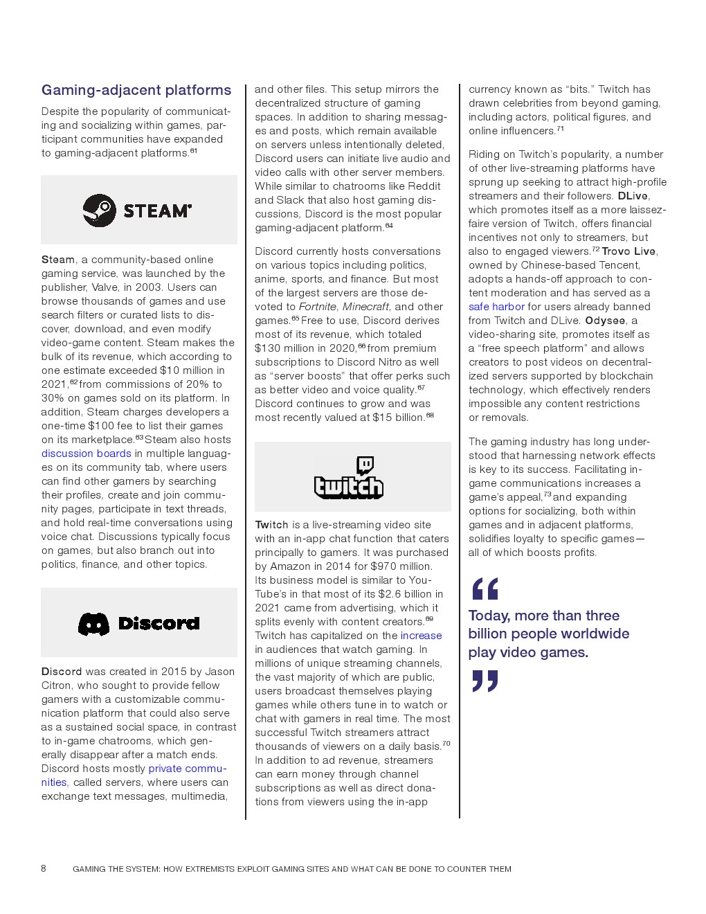 越来越多的证据表明,不良行为者利用电子游戏和相关平台的基本特征,传播基于仇恨的言论,与潜在的同情者建立联系,并动员采取行动,有时会带来致命的后果。极端分子能够相对轻松地操纵游戏空间,这表明行业参与者需要采取紧急行动,以避免进一步的伤害。尽管一些游戏公司最近已经投资了内容审核技术和系统,但大多数公司在适当管理和减少平台滥用方面仍然远远落后。